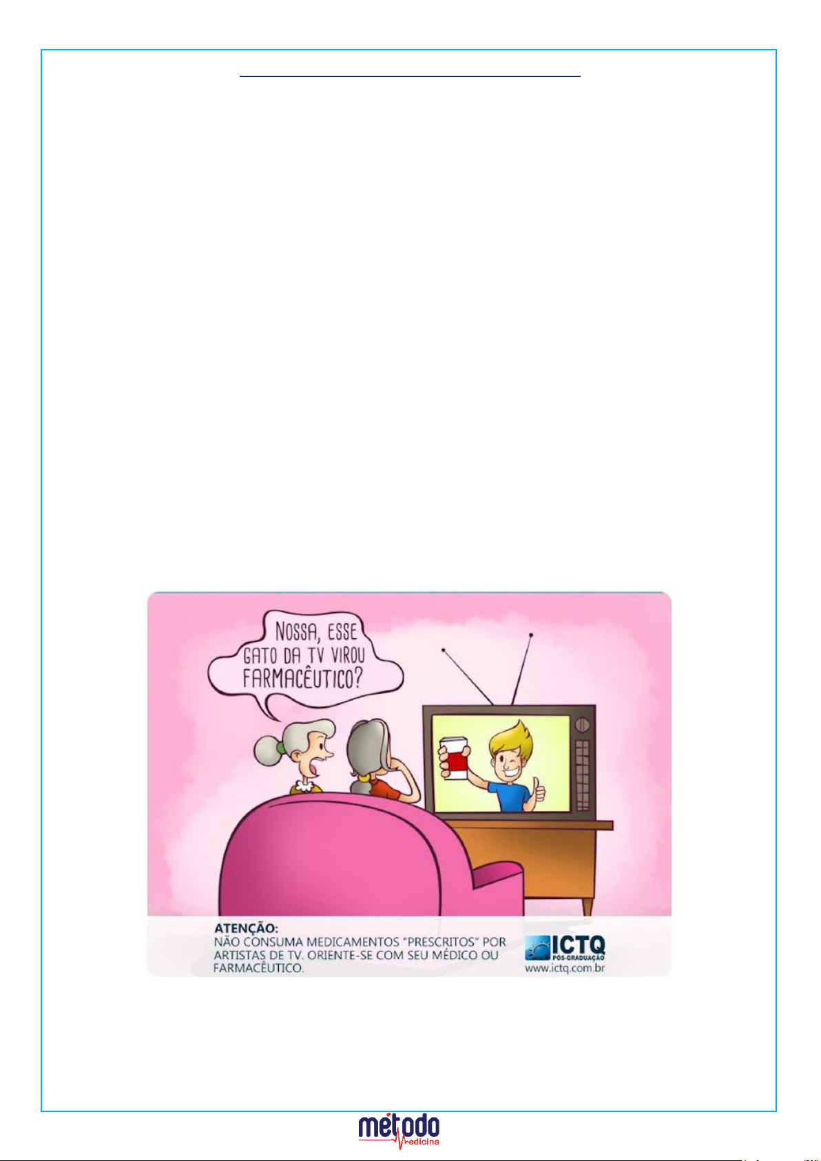 Redação PROPOSTA DE REDAÇÃO 03 – ACAFE Considerando seus conhecimentos e os textos 1 e 2, escreva um texto dissertativo-argumentativo sobre: a relação entre a mídia e a automedicação Texto 01: A automedicação, termo usado para designar a “ação de medicar-se por conta própria”, é uma prática largamente difundida no Brasil e no mundo. As consequências dessa prática podem ser desastrosas, gerar efeitos indesejados e imprevistos, causando danos à saúde – em função do risco – e, ao bolso dos usuários, por estar relacionado ao alto custo e à aquisição de produtos desnecessários. No Brasil, várias são as razões pelas quais os indivíduos se automedicam. Ela pode ser atribuída à dificuldade de acesso de grande parte da população a um médico ou a um odontólogo ou pelo hábito de resolver os problemas de saúde considerados rotineiros da sua própria maneira. A automedicação também é influenciada pelas mensagens publicitárias veiculadas pelos diversos meios de comunicação. Como boa parte dos medicamentos é vendida sem receita médica, comprar medicamento por conta própria, na farmácia mais próxima, tornou-se a primeira opção da maioria da população brasileira para tratar sintomas comuns à maioria das doenças. Adaptado de: https://www.gov.br/anvisa/pt-br/centraisdeconteudo/publicacoes/educacao-e-pesquisa/comunicacao- em-saude/campanha-a-informacao-e-o-melhor-remedio-guia-apoio.pdf Texto 02 Disponível em: https://www.assisramalho.com.br/2017/11/exposicao-sobre-risco-da-automedicacao.html