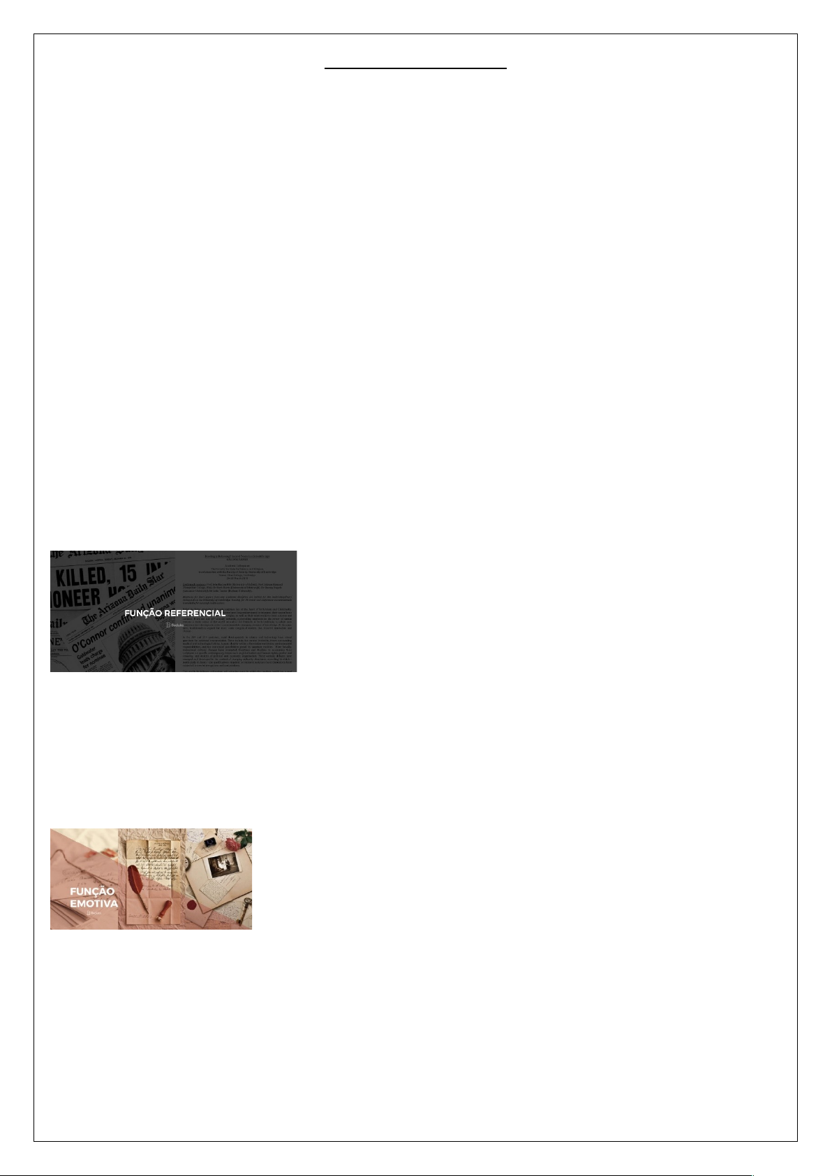 FUNÇÕES DA LINGUAGEM A linguagem é essencial para estabelecer comunicações e relações com outras pessoas. As funções da linguagem são maneiras de utilizar a linguagem de acordo com a intenção do falante. Elas podem ser separadas em seis tipos: 1. Função referencial; 2. Função emotiva; 3. Função poética; 4. Função fática; 5. Função conotativa; 6. Função metalinguística. Na comunicação, existe a mensagem, o emissor (quem emite a mensagem), o receptor (quem recebe a mensagem), o código, canal e contexto. As funções da linguagem desempenham o seu papel de acordo com cada elemento presente dentro da comunicação. O texto pode conter mais do que uma função, mesmo que ele seja composto por alguma outra mais predominante. Aprender cada função é essencial para fazer os exercícios sobre funções da linguagem, por isso vamos entender quais são as principais características de cada função. 1. Função Referencial A função referencial é conhecida também como denotativa e informativa. O principal objetivo é informar. As principais características da função referencial são: · Escrito na terceira pessoa do singular ou plural; · Caráter impessoal; · Informa sobre algo, sem que tenha subjetividade ou emoção à linguagem. Alguns exemplos desse tipo de função são os textos jornalísticos e artigos científicos. 2. Função Emotiva ou Expressiva Essa função, como o próprio nome já diz, tem como principal objetivo compartilhar emoções com o receptor, como os sentimentos, a subjetividade – a individualidade do emissor -, as suas opiniões e ideais. As principais características da função emotiva são: · Escrito em primeiro pessoa; Foca principalmente no emissor; Caráter pessoal; Transmite emoções para o receptor da mensagem. Os textos poéticos, as cartas, os diários e as mensagens pessoais são exemplos desse tipo de função. 3. Função Poética A função poética é marcada principalmente pela utilização do sentido conotativo das palavras. Por isso, o emissor se preocupa em como a mensagem será transmitida, quais figuras de linguagem serão utilizadas, entre outras coisas que interferem na chegada da mensagem até o receptor. Essa função está presente nos textos literários, na publicidade, nas expressões cotidianas que possuem metáforas, nas músicas, trocadilhos, anedotas e até em provérbios. 4. Função Fática O principal objetivo da função fática é estabelecer ou causar interrupções na comunicação. Ela tem como ênfase o canal de comunicação e a relação gerada entre o emissor e receptor. A função fática é utilizada em diálogos diários, como cumprimentar, discutir ao telefone, entre outros. 5. Função Conativa ou Apelativa A função conativa é conhecida também como apelativa, pois a sua linguagem é bastante persuasiva e tenta ao máximo convencer o leitor. As propagandas, publicidades e os discursos políticos são os que mais utilizam essa função. Assim, eles são capazes de influenciar e convencer o receptor por meio da mensagem passada. As principais características da função conativa são: · Influenciar o receptor; Linguagem persuasiva; Normalmente, é utilizada na segunda ou terceira pessoa; Uso de verbos imperativos e do vocativo. 6. Função Metalinguística A função metalinguística tem como principal característica fazer referências a si mesmo, com o uso da metalinguagem é possível explicar um código com o próprio código. Um exemplo é escrever um texto, explicando sobre a linguagem textual, ou escrever uma frase explicando o que é frase. Turno: Série/Ano: Professor (a): Disciplina: Data: EXERCÍCIOS SOBRE FUNÇÕES DA LINGUAGEM 1- Exercício sobre Funções da Linguagem – Enem 2010– Inep – A biosfera, que reúne todos os ambientes onde se desenvolvem os seres vivos, divide-se em unidades menores chamadas ecossistemas, que podem ser uma floresta, um deserto e até um lago. Um ecossistema tem múltiplos mecanismos que regulam o número de organismos dentro dele, controlando sua reprodução, crescimento e migrações. (DUARTE, M. O guia dos curiosos. São Paulo: Companhia das Letras, 1995.) Predomina no texto a função da linguagem: a) emotiva, porque o autor expressa seu sentimento em relação à ecologia. b) fática, porque o texto testa o funcionamento do canal de comunicação. c) poética, porque o texto chama a atenção para os recursos de linguagem. d) conativa, porque o texto procura orientar comportamentos do leitor. e) referencial, porque o texto trata de noções e informações conceituais. 2 – Exercício sobre Funções da Linguagem – Enem – Inep – Texto I Ser brotinho não é viver em um píncaro azulado; é muito mais! Ser brotinho é sorrir bastante dos homens e rir interminavelmente das mulheres, rir como se o ridículo, visível ou invisível, provocasse uma tosse de riso irresistível. CAMPOS, Paulo Mendes. Ser brotinho. In: SANTOS, Joaquim Ferreira dos (Org.). As cem melhores crônicas brasileiras. Rio de Janeiro: Objetiva, 2005. p. 91. Texto II Ser gagá não é viver apenas nos idos do passado: é muito mais! É saber que todos os amigos já morreram e os que teimam em viver são entrevados. É sorrir, interminavelmente, não por necessidade interior, mas porque a boca não fecha ou a dentadura é maior que a arcada. FERNANDES, Millôr. Ser gagá. In: SANTOS, Joaquim Ferreira dos (Org.). As cem melhores crônicas brasileiras. Rio de Janeiro: Objetiva, 2005. p. 225. Os textos I e II utilizam os mesmos recursos expressivos para definir as fases da vida de uma pessoa. Tal afirmação é confirmada pelo uso de: a) expressões coloquiais com significados semelhantes. b) afirmações enfáticas no aspecto contraditório da vida dos seres humanos. c) recursos específicos de textos escritos em linguagem formal. d) termos denotativos que se realizam com sentido objetivo. e) metalinguagem que explica com humor o sentido de palavras. 3 –