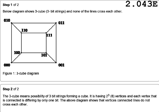 Step 1 of 2 2.043E Below diagram shows 3-cube (3- bit strings) and none of the lines cross each other. 010 011 110 111 100 101 000 001 Figure 1: 3-cube diagram Step 2 of 2 The 3-cube means possibility of 3 bit strings forming a cube. It is having 2³ (8) vertices and each vertex that is connected is differing by only one bit. The above diagram shows that vertices connected lines do not cross each other.