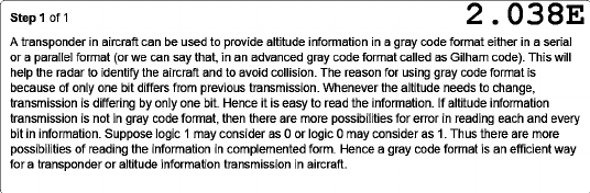 Step 1 of 1 2.038E A transponder in aircraft can be used to provide altitude information in a gray code format either in a serial or a parallel format (or we can say that, in an advanced gray code format called as Gilham code). This will help the radar to identify the aircraft and to avoid collision. The reason for using gray code format is because of only one bit differs from previous transmission. Whenever the altitude needs to change, transmission is differing by only one bit. Hence it is easy to read the information. If altitude information transmission is not in gray code format, then there are more possibilities for error in reading each and every bit in information. Suppose logic 1 may consider as 0 or logic 0 may consider as 1. Thus there are more possibilities of reading the information in complemented form. Hence a gray code format is an efficient way for a transponder or altitude information transmission in aircraft.