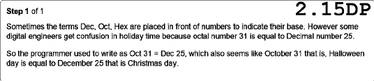 Step 1 of 1 2.15DP Sometimes the terms Dec, Oct, Hex are placed in front of numbers to indicate their base. However some digital engineers get confusion in holiday time because octal number 31 is equal to Decimal number 25. So the programmer used to write as Oct 31 = Dec 25, which also seems like October 31 that is, Halloween day is equal to December 25 that is Christmas day.