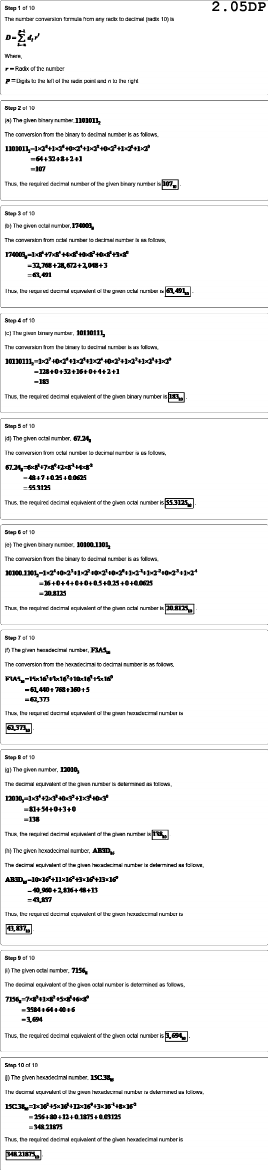 Step of 10 2.05DP The number conversion formula from any radix to decimal (radix 10) is Where, Radix of the number P =Digits to the left of the radix point and n to the right Step of 10 (a) The given binary number, 1101011, The conversion from the binary to decimal number is as follows, =64+32+8+2+1 =107 Thus, the required decimal number of the given binary number is 107, Step of 10 (b) The given octal number, The conversion from octal number to decimal number is as follows, =63,491 Thus, the required decimal equivalent of the given octal number is Step 10 (c) The given binary number, 10110111, The conversion from the binary to decimal number is as follows, =128+0+32+16+0+4+2+1 =183 Thus, the required decimal equivalent of the given binary number is 183, Step 10 (d) The given octal number, The conversion from octal number to decimal number is as follows, =55.3125 Thus, the required decimal equivalent of the given octal number is Step 10 (e) The given binary number, 10100.1101, The conversion from the binary to decimal number is as follows, =20.8125 Thus, the required decimal equivalent of the given octal number is 20.8125, Step of 10 (f) The given hexadecimal number, The conversion from the hexadecimal to decimal number is as follows, =61,440+768+160+5 =62,373 Thus, the required decimal equivalent of the given hexadecimal number is Step of 10 (g) The given number, 12010, The decimal equivalent of the given number is determined as follows, =81+54+0+3+0 =138 Thus, the required decimal equivalent of the given number is 138, (h) The given hexadecimal number, The decimal equivalent of the given hexadecimal number is determined as follows, =43,837 Thus, the required decimal equivalent of the given hexadecimal number is Step of 10 (i) The given octal number, 7156, The decimal equivalent of the given octal number is determined as follows, =3584+64+40+6 =3,694 Thus, the required decimal equivalent of the given octal number is Step 10 (j) The given hexadecimal number, The decimal equivalent of the given hexadecimal number is determined as follows, =348.21875 Thus, the required decimal equivalent of the given hexadecimal number is