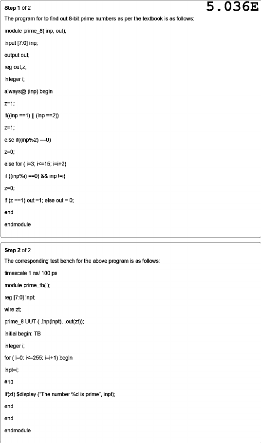 Step 1 of 2 5.036E The program for to find out 8-bit prime numbers as per the textbook is as follows: module prime_8( inp, out); input [7:0] inp; output out; reg out,z; integer i; always@ (inp) begin z=1; if((inp ==1) (inp ==2)) z=1; else if((inp%2) ==0) z=0; else for (i=3; i