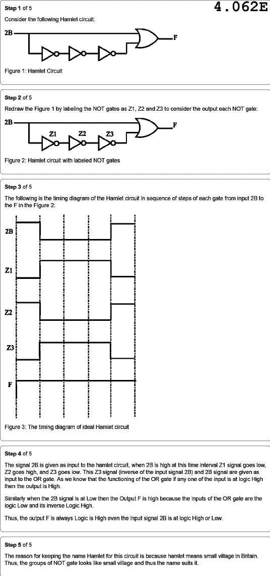 Step 1 of 5 4.062E Consider the following Hamlet circuit: 2B F Figure 1: Hamlet Circuit Step 2 of 5 Redraw the Figure 1 by labeling the NOT gates as Z1, Z2 and Z3 to consider the output each NOT gate: 2B F Z1 Z2 Z3 Figure 2: Hamlet circuit with labeled NOT gates Step 3 of 5 The following is the timing diagram of the Hamlet circuit in sequence of steps of each gate from input 2B to the F in the Figure 2: 2B Z1 Z2 Z3 F Figure 3: The timing diagram of ideal Hamlet circuit Step 4 of 5 The signal 2B is given as input to the hamlet circuit, when 2B is high at this time interval Z1 signal goes low, Z2 goes high, and Z3 goes low. This Z3 signal (inverse of the input signal 2B) and 2B signal are given as input to the OR gate. As we know that the functioning of the OR gate if any one of the input is at logic High then the output is High. Similarly when the 2B signal is at Low then the Output F is high because the inputs of the OR gate are the logic Low and its inverse Logic High. Thus, the output F is always Logic is High even the input signal 2B is at logic High or Low. Step 5 of 5 The reason for keeping the name Hamlet for this circuit is because hamlet means small village in Britain. Thus, the groups of NOT gate looks like small village and thus the name suits it.