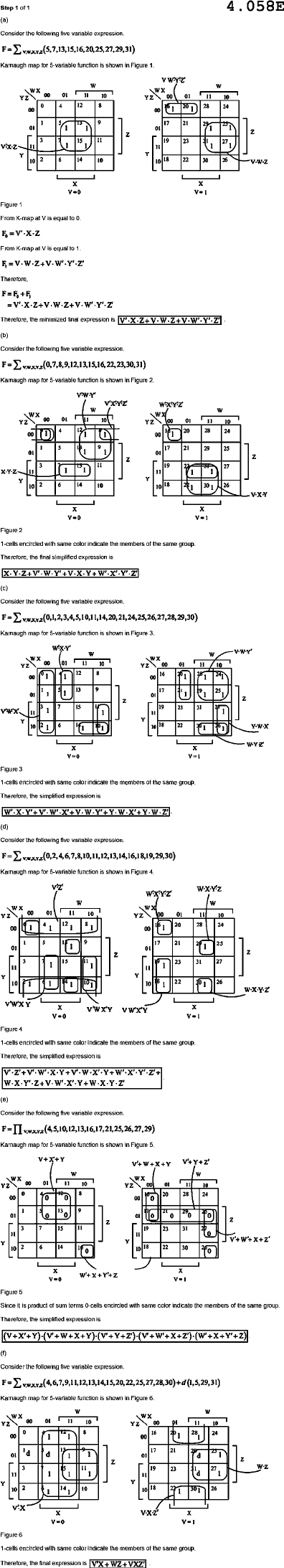 Step of 4.058E Consider the following five variable (5,7,13,15,16,25,27,29,31 Karnaugh map for 5-variable function is shown in Figure 1. VWYZ W 00 01 YZ 10 YZ 00 01 11 10 0 4 12 8 20 28 24 00 00 1 13 9 17 21 01 1 01 1 3 15 19 23 27 11 Y Y 10 2 6 14 10 10 18 22 30 26 V-W-Z [ - X V=1 Figure From K-map at Vis equal rom K-map equal to Therefore, the minimized final expression is Consider the following five variable Karnaugh map for -variable function is shown in Figure W W WX YZ / 00 01 YZ 01 = 10 4 20 28 00 24 00 5 17 21 29 25 01 01 z 3 19 27 = 1 11 1 L Y Y 10 2 6 14 10 10 18 30 26 V-X-Y - X X V=1 Figure 2 -cells encircled with same color indicate the members of the same Therefore, the final simplified expression is (c) Consider the following five variable expression Karnaugh map for -variable function is shown in Figure 3. V-W-Y' 00 01 11 YZ 10 YZ 00 01 10 1 12 8 16 00 00 13 9 17 01 - 25 01 Z 7 15 19 23 31 1 Y Y 10 6 10 18 22 Y-W-X L X V-0 Figure 3 I-cells encircled with same color indicate the members of the same Therefore, the simplified expression is Consider the following five variable Karnaugh map for 5-variable function is shown in Figure 4. WXYZ 00 01 YZ 10 YZ 01 10 12 1 20 28 24 00 00 5 9 17 21 01 1 25 01 3 15 23 31 27 II - II - Y Y 10 10 22 26 VWXY VWXY X V=1 Figure -cells encircled with same color indicate the members of the same group Therefore, the simplified expression is Consider the following five variable expression. Karnaugh map for variable function is shown in Figure 5. V+X+Y V'+Y+Z' 00 01 10 YZ 00 01 = 10 0 8 20 28 24 00 0 00 0 9 21 01 01 0 3 7 15 19 23 31 11 Y 10 2 6 14 10 18 22 0 30 X W+X+Y+Z V=0 Figure Since it is product of sum terms encircled with same color indicate the members of the same group Therefore, the simplified expression is (f) Consider the following five variable Karnaugh map for 5-variable function is shown in Figure 6. W W YZ 00 01 11 10 YZ 00 11 10 0 8 16 28 24 00 1 00 17 21 01 1 01 d z 3 11 19 23 27 W-Z 11 1 1 d Y Y 10 2 14 10 10 18 22 26 - V=0 V=1 Figure -cells encircled with same color indicate the members of the same group Therefore, the final expression VX+WZ+VXZ