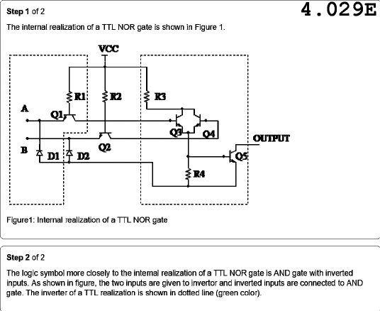 Step 1 of 2 4.029E The internal realization of a TTL NOR gate is shown in Figure 1. VCC R1 R2 K3 Q1 04 OUTPUT B D1 D2 R4 Figure1: Internal realization of a TTL NOR gate Step 2 of 2 The logic symbol more closely to the intemal realization of a TTL NOR gate is AND gate with inverted inputs. As shown in figure, the two inputs are given to invertor and inverted inputs are connected to AND gate. The inverter of a TTL realization is shown in dotted line (green color).