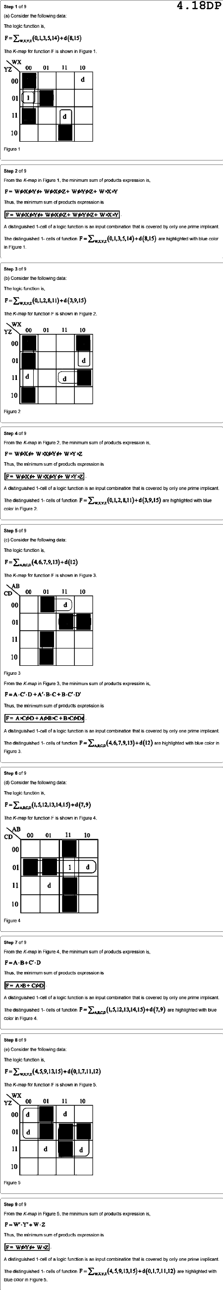 Step 1 of 9 4.18DP (a) Consider the following data: The logic function is, F= (0,1,3,5,14)+d(8,15) The K-map for function is shown Figure 1. WX YZ 00 01 11 10 00 d 01 1 11 d 10 Figure Step 2 of 9 From the K-map in Figure the minimum sum of products expression is, F= Thus, the minimum sum products expression A distinguished 1-cell of logic function an input combination that is covered by only one prime implicant. The distinguished cells of function F= (0,1,3,5,14)+d(8,15) are highlighted with blue color in Figure Step 3 of 9 (b) Consider the following data: The logic function F= (0,1,2,8,11)+d(3,9,15) The K-map for function shown in Figure 2. WX YZ 00 01 11 10 00 01 d 11 d d 10 Figure Step 4 of 9 From the -map in Figure 2. the minimum sum products expression F= Thus, the minimum sum of products expression is A distinguished 1-cell of logic function an input combination that covered by only one prime The distinguished 1- cells of function F= (0,1,2,8,11)+d(3,9,15) are highlighted with blue color Figure 2. Step 5 of 9 (c) Consider the following The logic function F= (4,6,7,9,13)+d(12) The K-map for function is shown in Figure AB CD 00 01 11 10 00 d 01 11 10 Figure From the K-map Figure the minimum sum of products expression is, F=A C' D Thus, the minimum sum products expression is A distinguished 1-cell of logic function an input combination that is covered by only one prime implicant The distinguished cells of function F= (4,6,7,9,13)+d(12) are highlighted with blue color in Figure Step (d) Consider the following data: The logic function F= (1,5,12,13,14,15)+d(7,9) The K-map for function is shown in Figure 4. \AB CD 00 01 11 10 00 + 01 1 d + 11 d 10 Figure Step From the in Figure the minimum sum of products expression Thus, the minimum sum of products expression is A distinguished 1-cell of logic function an input combination that is covered by only one prime The distinguished cells of function F= are highlighted with blue color Figure Step (e) Consider the following data: The logic function F= (4,5,9,13,5)+d(0,1,7,1,12 The K-map for function shown Figure WX YZ 00 01 11 10 00 d d 01 d 11 d d 10 Figure Step 9 of 9 From the Figure 5, the minimum sum of products expression is, Thus, the minimum sum of products expression is F= A distinguished cell of logic function an input combination that is covered by only one prime implicant. The distinguished cells of function F= are highlighted with blue color