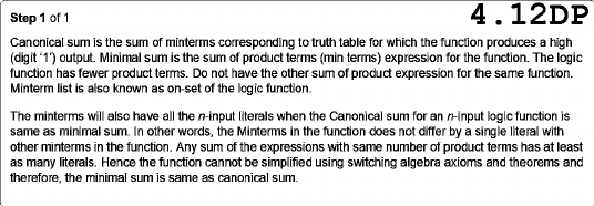 Step 1 of 1 4.12DP Canonical sum is the sum of minterms corresponding to truth table for which the function produces a high (digit '1') output. Minimal sum is the sum of product terms (min terms) expression for the function. The logic function has fewer product terms. Do not have the other sum of product expression for the same function. Minterm list is also known as on-set of the logic function. The minterms will also have all the n-input literals when the Canonical sum for an n-input logic function is same as minimal sum. In other words, the Minterms in the function does not differ by a single literal with other minterms in the function. Any sum of the expressions with same number of product terms has at least as many literals. Hence the function cannot be simplified using switching algebra axioms and theorems and therefore, the minimal sum is same as canonical sum.