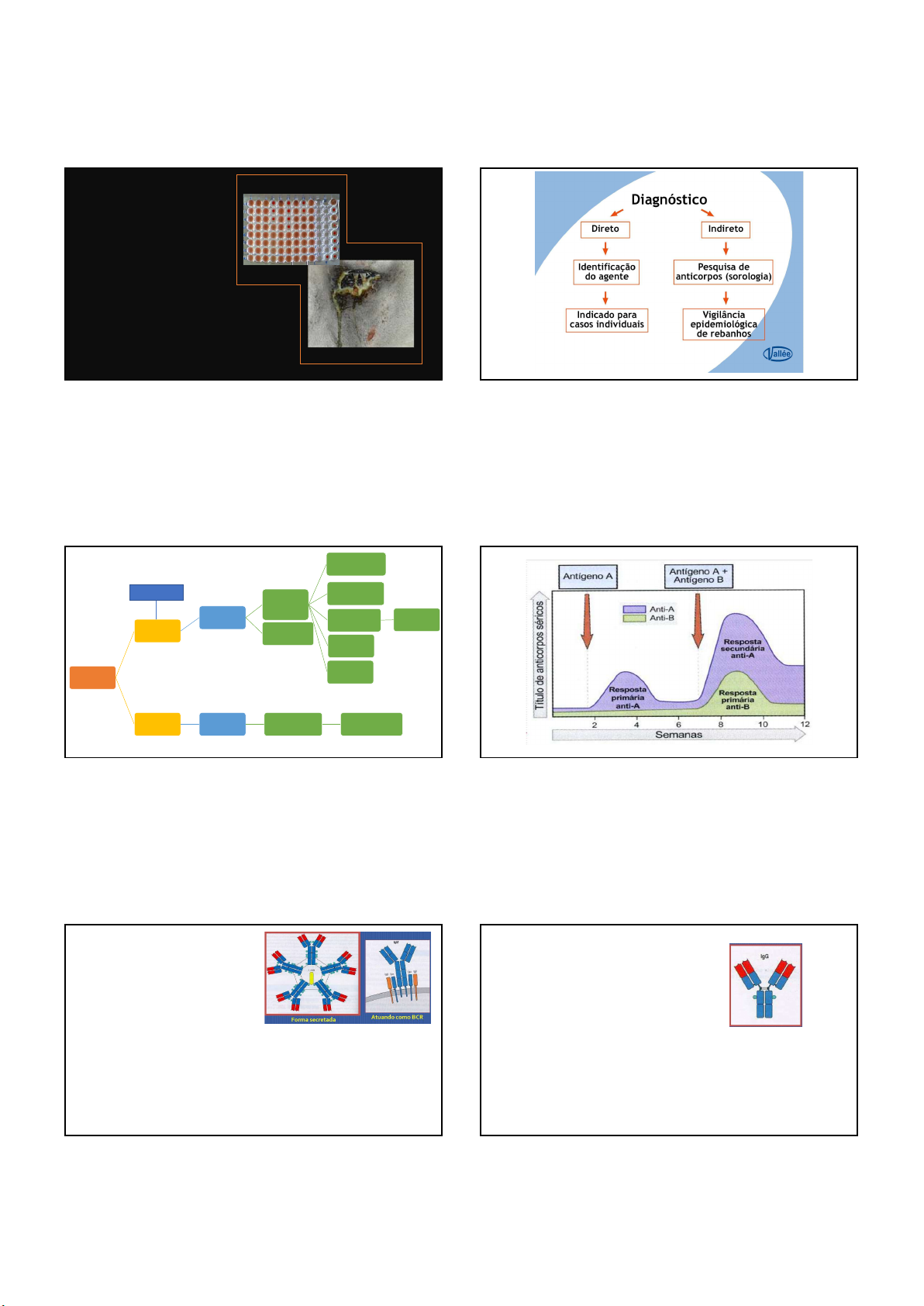 13/05/2025 IMUNODIAGNÓSTICO TESTES SOROLÓGICOS X TESTES CELULARES RESPOSTA IMUNE ADQUIRIDA IMUNIDADE HUMORAL ANTICORPOS CONTRA M.O. EXTRACELULARES E TOXINAS PODEM ATIVAR DIFERENTES MECANISMOS EFETORES ATIVAÇÃO DO SISTEMA COMPLEMENTO FACILITAM A FAGOCITOSE (OPSONIZAÇÃO) LIBERAÇÃO DE FATORES INFLAMATÓRIOS MASTÓCITOS NEUTRALIZAÇÃO ATIVAÇÃO DOS LINFOCITOS NK IMUNIDADE CELULAR LINFOCITOS T CONTRA M.O. INTRACELULARES DESTRUIÇÃO E LISE DAS CÉLULAS INFECTADAS LINFOCITOS B IgM • NEUTRALIZA TOXINAS • FIXAM COMPLEMENTO • RECEPTOR DE Ag NOS LINF. B • PRESENTES NO INÍCIO DA RESPOSTA IMUNE ADAPTATIVA • PRESENTE NO SORO • FORMA MONOMÉRICA E PENTAMÉRICA IgG • QUATRO SUBCLASSES: IgG1, IgG2, IgG3 e IgG4 • NEUTRALIZA TOXINAS (TODAS) • FAZEM OPSONIZAÇÃO (IgG1 e IgG3) • FIXAM COMPLEMENTO (IgG1, IgG2 e IgG3) • ATRAVESSAM A PLACENTA (IgG2) • ATIVAM LINFOCITOS NK (IgG1 e IgG3) • PREDOMINAM NAS RESPOSTAS IMUNES SECUNDÁRIAS 1 2 3 4 5 6 13/05/2025 Características • Especificidade: Capacidade de um único sítio combinatório do anticorpo reagir com apenas um epítopo. • Afinidade: É a força de ligação entre um único epítopo e um único sítio combinatório de anticorpo. (Afinidade = forças de atração e repulsão) Características IgG IgM• Avidez: É a força de ligação total entre um antígeno com muitos epítopos e anticorpos multivalentes. Portanto, a avidez é a medida da estabilidade geral dos imunocomplexo entre o antígeno e o anticorpo. Sorologia – TITULAÇÃO Técnicas de imunodiagnóstico • Teste do Antígeno Acidificado Tamponado (AAT) • Ensaio de imunoabsorção enzimático/Enzyme-Linked Immunosorbent Assay (ELISA); • Técnica de fixação do complemento (TFC); • Western Blotting (WB); • Reação de imunofluorescência indireta (RIFI); • Imunodifusão em gel de ágar (IDGA) • Imunocromatográfico. • Testes celulares TESTE DO ANTÍGENO ACIDIFICADO TAMPONADO (AAT) OU TESTE DE ROSA BENGALA (RBT) • Sensibilidade variável com a temperatura; • Falsos-positivos pela vacinação e reações cruzadas; • IgG. Fonte: Arquivo PessoalFonte: Arquivo Pessoal 7 8 9 10 11 12 13/05/2025 ELISA A detecção da reação antígeno-anticorpo ocorre por meio da conjugação de um desses componentes com uma enzima que age sobre um substrato alterando a coloração do meio, que pode ser mensurada por auxilio de espectrofotometria. • ELISA indireto (i) • ELISA direto (d) • ELISA competitivo (c) ELISAi • UTILIZAÇÃO DO SORO TESTE (Ac) + UM ANTI- ANTICORPO CONJUGADO A UMA ENZIMA. Fonte: Arquivo Pessoal Fonte: Arquivo Pessoal ELISAd • DETECÇÃO DIRETA DO ANTÍGENO NA AMOSTRA Fonte: Arquivo Pessoal ELISAc • UTILIZAÇÃO DE UM ANTICORPO CONJUGADO A ENZIMA JUNTO COM O SORO TESTE (Ac) EM UMA PLACA CONTENDO ANTÍGENO. Fonte: Arquivo Pessoal Fonte: Arquivo Pessoal ESPECTROFOTOMETRIA Fonte: Arquivo Pessoal 13 14 15 16 17 18 13/05/2025 ESPECTROFOTOMETRIA Fonte: Arquivo Pessoal ESPECTROFOTOMETRIA Fonte: Arquivo Pessoal • Detecção da interação antígeno-anticorpo; • Detecção de proteínas imunoespecíficas; • Ferramenta para a tomada de decisões e interpretações a respeito do resultado muito mais eficiente (KIM et al., 2014). Western Blotting Fonte: Arquivo Pessoal Fonte: Ko et al (2012). Identificação das bandas em gel Fonte: Arquivo Pessoal MOPS RUNNIG Buffer Fonte: Arquivo Pessoal Identificação das bandas em gel Fonte: Arquivo Pessoal Coloração por prata (SilverXpress®) Fonte: Arquivo Pessoal 19 20 21 22 23 24 13/05/2025 Produção das membranas 3x de 20min Membrana após transferência Membrana cortada após lavagens Fonte: Arquivo Pessoal Fonte: Arquivo Pessoal Fonte: Arquivo Pessoal Execução do ensaio Fonte: Arquivo Pessoal Fonte: Arquivo Pessoal Leitura Fonte: Arquivo Pessoal Fonte: Arquivo Pessoal Teste de Fixação do Complemento – TFC • M’Fadyean & Stckman, 1909; • Teste confirmatório; • Possui o emprego de vários antígenos; d i l u i ç ã o AC Fonte: Arquivo Pessoal Fonte: Arquivo Pessoal Fonte: Arquivo Pessoal FIXAÇÃO DO COMPLEMENTO => = Ag SORO POSITIVO COMPLEMENTO HEMÁCIA HEMOLISINA SORO NEGATIVO = LISE DAS CÉLULAS Fonte: Lanagro-PE = DEPOSITO DE CÉLULAS 25 26 27 28 29 30 13/05/2025 Imunodifusão em gel de ágar A técnica de IDGA baseia-se na migração radial dupla de antígeno (Ag) e anticorpo (Ac), através da agarose. O encontro dos reagentes, em proporções ótimas, leva à formação de complexos Ag-Ac insolúveis que precipitam, tornando-se visíveis sob a forma de uma linha ou banda de precipitação. Fonte: Arquivo Pessoal Fonte: Arquivo Pessoal Fonte: Arquivo Pessoal Fonte: Arquivo Pessoal Teste do anel do leite - TAL • Detecção de IgA • Produz reação falso positiva: leite ácido, colostro e leite mastítico POSITIVONEGATIVO 31 32 33 34 35 36 13/05/2025 SOROALGUTINAÇÃO LENTA EM TUBOS (SAT) e TESTE DE 2-MERCAPTOETANOL (2-ME) • Realização em paralelo • SAT detecta IgM e IgG e 2-ME detecta IgG • Alta especificidade • Reação falso-positiva com Ac da vacinação Imunocromatográfico Apesar do nome complicado, o conceito por trás do exame é simples. O teste Imunocromatográfico é um tipo de teste rápido que identifica doenças infecciosas, hormônios e outros analitos, por associação específica a anticorpos com partículas coloridas conjugadas. Tuberculinização • Teste da prega caudal – TPC • Teste cervical simples – TCS • Teste cervical comparativo – TCC Departamento de Defesa Animal - SDA - MAPA http://www.extension.umn.edu/beef/components/pdfs/cowcalfdays06/BovineTuberculosis.pdf Departamento de Defesa Animal - SDA - MAPA Departamento de Defesa Animal - SDA - MAPA Teste da Prega Caudal – (TPC) Inoculação de PPD Bovino 37 38 39 40 41 42 13/05/2025 Departamento de Defesa Animal - SDA - MAPA Reação tuberculínica positiva em bovino. Teste da Prega Caudal – (TPC) Departamento de Defesa Animal - SDA - MAPA tricotomia Departament