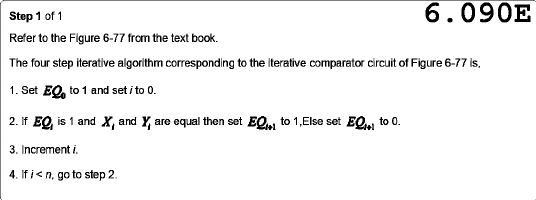 Step 1 of 1 6.090E Refer to the Figure 6-77 from the text book. The four step iterative algorithm corresponding to the iterative comparator circuit of Figure 6-77 is, 1. Set to 1 and set to 0. 2. If EQ, is 1 and X, and Y, are equal then set to 1,Else set to 0. 3. Increment i. 4. If i go to step 2.