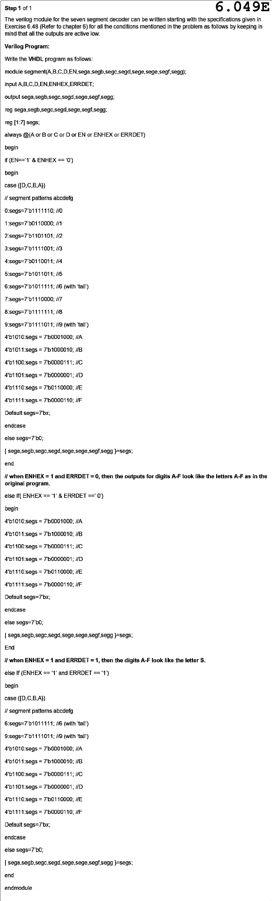 Step of 1 6.049E The verilog module for the seven segment decoder can be written starting with the specifications given in Exercise 6.48 (Refer to chapter 6) for all the conditions mentioned in the problem as follows by keeping in mind that all the outputs are active low. Verilog Program: Write the VHDL program as follows: module input A,B,C,D,EN,ENHEX,ERRDET; output sega,segb,segc,segd,sege,segf,segg; reg reg [1:7] segs; always @(A or B or C or D or EN or ENHEX or ERRDET) begin if (EN=='1' & ENHEX == '0') begin case ([D,C,B,A}) // segment patterns abcdefg 2:segs=7'b1101101; 3:segs=7'b1111001; 4:segs=7'b0110011; 1/6 (with 'tail') (with 4'b1010:segs = 7'b0001000; 4'b1011:segs = 7'b1000010; 4'b1100:segs = 7'b0000111; 4'b1101:segs = 7'b0000001; 4'b1110:segs = 7'b0110000; 4'b1111:segs = 7'b0000110; Default segs=7'bx; endcase else segs=7'b0; }=segs; end when ENHEX = 1 and ERRDET = 0, then the outputs for digits A-F look like the letters A-F as in the original program. else If( ENHEX == '1' & ERRDET ==' 0') begin 4'b1010:segs = 7'b0001000; 4'b1011:segs = 7'b1000010; 4'b1100:segs = 7'b0000111; I/C 4'b1101:segs = 7'b0000001; 4'b1110:segs = 7'b0110000; 4'b1111:segs = 7'b0000110; //F Default segs=7'bx; endcase else segs=7'b0; }=segs; End when ENHEX = 1 and ERRDET = 1, then the digits A-F look like the letter S. else If (ENHEX == '1' and ERRDET == '1') begin case ([D,C,B,A}) // segment patterns abcdefg 1/6 (with 'tail') 9:segs=7'b1111011; (with 'tail') 4'b1010:segs = 7'b0001000; 4'b1011:segs = 7'b1000010; 4'b1100:segs = 7'b0000111; 4'b1101:segs = 7'b0000001; 4'b1110:segs = 7'b0110000; 4'b1111:segs = 7'b0000110; Default segs=7'bx; endcase else segs=7'b0; }=segs; end endmodule