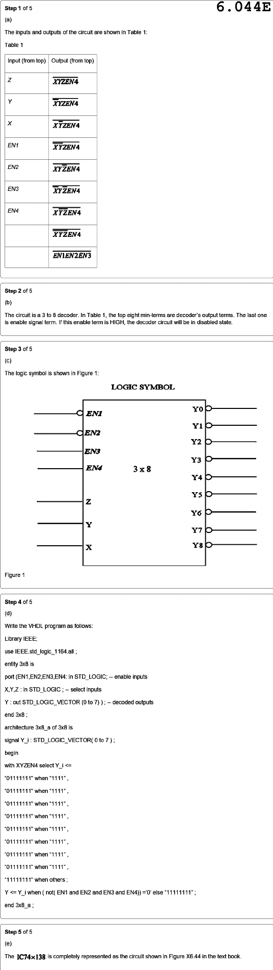 Step of 5 6.044E (a) The inputs and outputs of the circuit are shown in Table 1: Table 1 Input (from top) Output (from top) Z XYZEN4 Y XYZEN4 XYZEN4 EN1 XYZEN4 EN2 XYZEN4 EN3 XYZEN4 EN4 XYZEN4 XYZEN4 ENIEN2EN3 Step of 5 (b) The circuit is a 3 to 8 decoder. In Table 1, the top eight min-terms are decoder's output terms. The last one is enable signal term. If this enable term is HIGH, the decoder circuit will be in disabled state. Step of 5 (c) The logic symbol is shown in Figure 1: LOGIC SYMBOL Y0 ENI Y1 EN2 Y2 EN3 Y3 EN4 Y4 Y5 Z Y6 Y Y7 Y8 Figure 1 Step of 5 (d) Write the VHDL program as follows: Library IEEE; use IEEE.std_logic_1164.all; entity 3x8 is port (EN1,EN2,EN3,EN4: in STD_LOGIC; enable inputs X,Y,Z in STD_LOGIC select inputs Y: out STD_LOGIC_VECTOR (0 to 7)); - decoded outputs end 3x8; architecture 3x8_a of 3x8 is signal Y_i: STD_LOGIC_VECTOR( 0 to 7); begin with XYZEN4 select Y_i