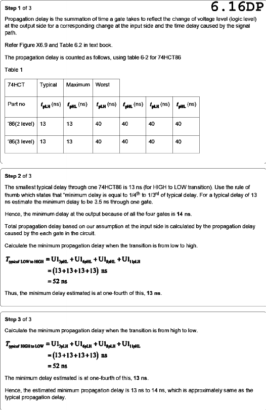 Step 1 of 3 6.16DP Propagation delay is the summation of time a gate takes to reflect the change of voltage level (logic level) at the output side for a corresponding change at the input side and the time delay caused by the signal path. Refer Figure X6.9 and Table 6.2 in text book. The propagation delay is counted as follows, using table 6-2 for 74HCT86 Table 1 74HCT Typical Maximum Worst Part no 'PLH (ns) (ns) 'PLH (ns) (ns) (ns) (ns) '86(2 level) 13 13 40 40 40 40 '86(3 level) 13 13 40 40 40 40 Step 2 of 3 The smallest typical delay through one 74HCT86 is 13 ns (for HIGH to LOW transition). Use the rule of thumb which states that "minimum delay is equal to 1/4th to of typical delay. For a typical delay of 13 ns estimate the minimum delay to be 3.5 ns through one gate. Hence, the minimum delay at the output because of all the four gates is 14 ns. Total propagation delay based on our assumption at the input side is calculated by the propagation delay caused by the each gate in the circuit. Calculate the minimum propagation delay when the transition is from low to high. Typical = =(13+13+13+13) ns Thus, the minimum delay estimated is at one-fourth of this, 13 ns. Step 3 of 3 Calculate the minimum propagation delay when the transition is from high to low. Typical HIGH to LOW = =(13+13+13+13) ns The minimum delay estimated is at one-fourth of this, 13 ns. Hence, the estimated minimum propagation delay is 13 ns to 14 ns, which is approximately same as the typical propagation delay.