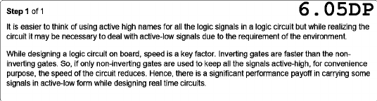 Step 1 of 1 6.05DP It is easier to think of using active high names for all the logic signals in a logic circuit but while realizing the circuit it may be necessary to deal with active-low signals due to the requirement of the environment. While designing a logic circuit on board, speed is a key factor. Inverting gates are faster than the non- inverting gates. So, if only non-inverting gates are used to keep all the signals active-high, for convenience purpose, the speed of the circuit reduces. Hence, there is a significant performance payoff in carrying some signals in active-low form while designing real time circuits.