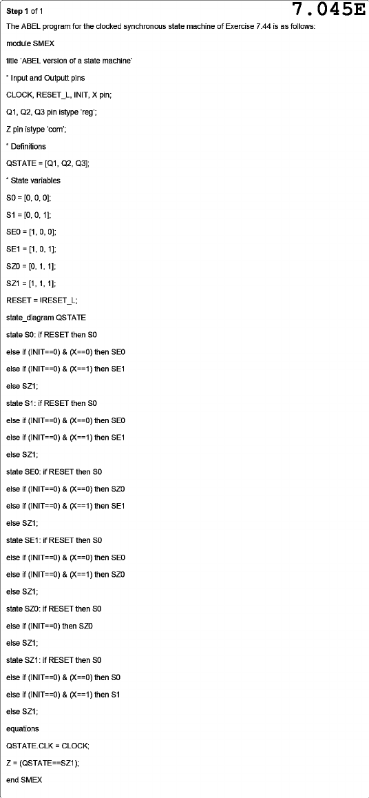 Step 1 of 1 7.045E The ABEL program for the clocked synchronous state machine of Exercise 7.44 is as follows: module SMEX title 'ABEL version of a state machine' " Input and Outputt pins CLOCK, RESET_L, INIT, X pin; Q1, Q2, Q3 pin istype 'reg'; Z pin istype 'com'; " Definitions QSTATE = [Q1, Q2, Q3]; " State variables = [0, 0, 0]; S1 = [0, 0, 1]; SE0 = [1, 0, 0]; SE1 = [1, 0, 1]; SZ0 = [0, 1, 1]; SZ1 = [1, 1, 1]; RESET = !RESET_L; state_diagram QSTATE state if RESET then else if (INIT==0) & (X==0) then SE0 else if (INIT==0) & (X==1) then SE1 else SZ1; state S1: if RESET then S0 else if (INIT==0) & (X==0) then else if (INIT==0) & (X==1) then SE1 else SZ1; state SE0: if RESET then else if (INIT==0) & (X==0) then SZ0 else if (INIT==0) & (X==1) then SE1 else SZ1; state SE1: if RESET then S0 else if (INIT==0) & (X==0) then SE0 else if (INIT==0) & (X==1) then SZ0 else SZ1; state SZ0: if RESET then else if (INIT==0) then SZ0 else SZ1; state SZ1: if RESET then S0 else if (INIT==0) & (X==0) then S0 else if (INIT==0) & (X==1) then S1 else SZ1; equations QSTATE.CLK = CLOCK; Z = (QSTATE==SZ1); end SMEX