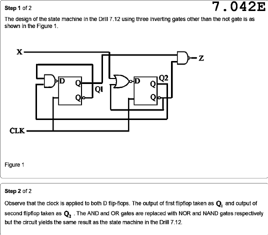 Step 1 of 2 7.042E The design of the state machine in the Drill 7.12 using three inverting gates other than the not gate is as shown in the Figure 1. Z D D Q2 Q1 CLK Figure 1 Step 2 of 2 Observe that the clock is applied to both D flip-flops. The output of first flipflop taken as and output of second flipflop taken as The AND and OR gates are replaced with NOR and NAND gates respectively but the circuit yields the same result as the state machine in the Drill 7.12.