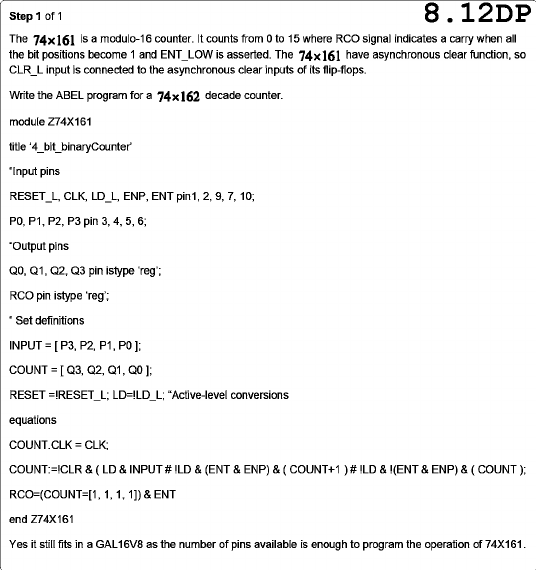 Step 1 of 1 8.12DP The 74x161 is a modulo-16 counter. It counts from 0 to 15 where RCO signal indicates a carry when all the bit positions become 1 and ENT_LOW is asserted. The 74x161 have asynchronous clear function, so CLR_L input is connected to the asynchronous clear inputs of its flip-flops. Write the ABEL program for a 74x162 decade counter. module Z74X161 title '4_bit_binaryCounter' "Input pins RESET_L, CLK, LD_L, ENP, ENT pin1, 2, 9, 7, 10; P1, P2, P3 pin 3, 4, 5, 6; "Output pins Q0, Q1, Q2, Q3 pin istype 'reg'; RCO pin istype 'reg'; definitions INPUT = [ P3, P2, P1, ]; COUNT = [Q3, Q2, Q1, Q0 ]; RESET =!RESET_L; LD=!LD_L; "Active-level conversions equations COUNT.CLK = CLK; COUNT:=!CLR & (LD & INPUT # !LD & (ENT & ENP) & ( COUNT+1 ) # !LD & !(ENT & ENP) & (COUNT ); RCO=(COUNT=[1, 1, 1, 1]) & ENT end Z74X161 Yes it still fits in a GAL16V8 as the number of pins available is enough to program the operation of 74X161.