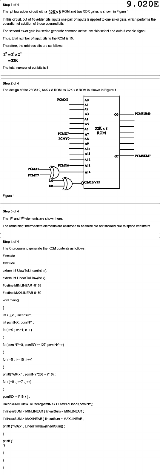Step of 4 9.020E The law adder circuit with a 32Kx8 ROM and two XOR gates is shown in Figure 1. In this circuit, out of 16 adder bits inputs one pair of inputs is applied to one ex-or gate, which performs the operation of addition of those operand bits. The second ex-or gate is used to generate common active low chip select and output enable signal. Thus, total number of input bits to the ROM is 15. Therefore, the address bits are as follows: = 32K The total number of out bits is 8. Step 2 of 4 The design of the 28C512, 64K X 8 ROM as 32K X 8 ROM is shown in Figure 1. PCMX0 A0 A2 A3 00 PCMSUM0 A4 A6 32K 8 PCMX7 A7 ROM PCMY0 A8 A9 A10 All 07 PCMSUM7 A12 PCMY6 A13 PCMX7 A14 PCMY7 1/0 o CS/OE/VPP 1/0 Figure 1 Step 3 of 4 The and 7th elements are shown here. The remaining intermediate elements are assumed to be there did not showed due to space constraint. Step 4 of 4 The C program to generate the ROM contents as follows: #include #include extem int UlawToLinear(int in); extem int LinearToUlaw(int x); #define MINLINEAR -8159 #define MAXLINEAR 8159 void main() { int linearSum; int pcmlNX, for(e=0; e MAXINEAR) linearSum = printf ("%02x", LinearToUlaw(linearSum) } printf (" ") } } }