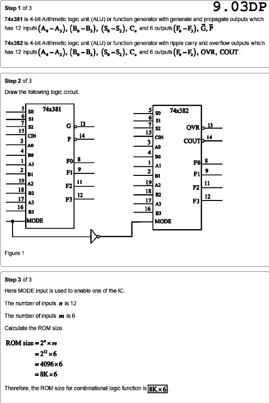 Step 1 of 3 9.03DP 74x381 is 4-bit Arithmetic logic unit (ALU) or function generator with generate and propagate outputs which has 12 inputs (B₀-B₃), C, and 6 outputs 74x382 is 4-bit Arithmetic logic unit (ALU) or function generator with ripple carry and overflow outputs which has 12 inputs (B₀-B₃), C, and 6 outputs OVR, COUT. Step 2 of 3 Draw the following logic circuit. 5 74x381 5 74x382 6 SI 6 7 SI S2 G 13 7 OVR 13 15 S2 15 CIN 14 3 P CIN 14 3 COUT A0 A0 4 4 B0 8 B0 1 F0 1 F0 8 2 9 B1 2 9 BI 19 A2 19 F2 A2 11 18 F2 B2 18 12 B2 17 F3 12 A3 17 F3 A3 16 16 B3 B3 MODE MODE Figure 1 Step 3 of 3 Here MODE input is used to enable one of the IC. The number of inputs n is 12 The number of inputs m is 6 Calculate the ROM size. ROM size = 2" = =4096x6 =8Kx6 = Therefore, the ROM size for combinational logic function is 8Kx6
