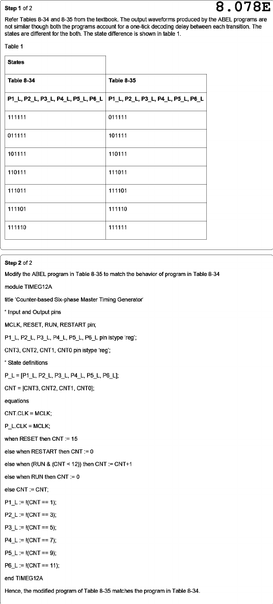 Step 1 of 2 8.078E Refer Tables 8-34 and 8-35 from the textbook. The output waveforms produced by the ABEL programs are not similar though both the programs account for a one-tick decoding delay between each transition. The states are different for the both. The state difference is shown in table 1. Table 1 States Table 8-34 Table 8-35 P1_L,P2_L,P3_L,P4_L,P5_L,P6_L 111111 011111 011111 101111 101111 110111 110111 111011 111011 111101 111101 111110 111110 111111 Step 2 of 2 Modify the ABEL program in Table 8-35 to match the behavior of program in Table 8-34 module TIMEG12A title Six-phase Master Timing 'Input and Output pins MCLK, RESET, RUN, RESTART pin; P1_L, P2_L, P3_L, P4_L, P5_L, P6_L pin istype 'reg'; CNT3, CNT2, CNT1, CNT0 pin istype 'reg'; " State definitions CNT = [CNT3, CNT2, CNT1, CNT0]; equations CNT.CLK = MCLK; P_L.CLK = MCLK; when RESET then CNT := 15 else when RESTART then CNT := 0 else when (RUN & (CNT