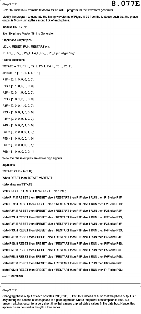 Step 1 of 2 8.077E Refer to Table 8-32 from the textbook for an ABEL program for the waveform generator. Modify the program to generate the timing waveforms of Figure 8-55 from the textbook such that the phase output is 0 only during the second tick of each phase. module TIMEGEN6 title Master Timing Generator' Input and Output pins MCLK, RESET, RUN, RESTART pin; 'reg'; State definitions TSTATE = P1F = [0, 1, 0, 0, 0, 0, 0]; P1S = [1, 1, 0, 0, 0, 0, 0]; P2F = [0, 0, 1, 0, 0, 0, 0]; P2S = [1, 0, 1, 0, 0, 0, 0]; P3F = [0, 0, 0, 1, 0, 0, 0]; P3S = [1, 0, 0, 1, 0, 0, 0]; P4S = [1, 0, 0, 0, 1, 0, 0]; P5F = [0, 0, 0, 0, 0, 1, 0]; P5S = [1, 0, 0, 0, 0, 1, 0]; P6F = [0, 0, 0, 0, 0, 0, 1]; P6S = [1, 0, 0, 0, 0, 0, 1]; "Now the phase outputs are active high signals equations TSTATE.CLK = MCLK; When RESET then TSTATE:=SRESET; state_diagram TSTATE state SRESET: if RESET then SRESET else P1F; state P1F: if RESET then SRESET else if RESTART then P1F else if RUN then P1S else P1F; state P1S: if RESET then SRESET else if RESTART then P1F else if RUN then P2F else P1S; state P2F: if RESET then SRESET else if RESTART then P1F else if RUN then P2S else P2F; state P2S: if RESET then SRESET else if RESTART then P1F else if RUN then P3F else P2S; state P3F: if RESET then SRESET else if RESTART then P1F else if RUN then P3S else P3F; state P3S: if RESET then SRESET else if RESTART then P1F else if RUN then P4F else P3S; state P4F: if RESET then SRESET else if RESTART then P1F else if RUN then P4S else P4F; state P4S: if RESET then SRESET else if RESTART then P1F else if RUN then P5F else P4S; state P5F: if RESET then SRESET else if RESTART then P1F else if RUN then P5S else P5F; state P5S: if RESET then SRESET else if RESTART then P1F else if RUN then P6F else P5S; state P6F: if RESET then SRESET else if RESTART then P1F else if RUN then P6S else P6F; state P6S: if RESET then SRESET else if RESTART then P1F else if RUN then P1F else P6S; end TIMEGEN6 Step 2 of 2 Changing phase output of each of states P1F, P2F, P6F to 1 instead of 0, so that the phase output is 0 only during the second of each phase is a good approach where the power consumption is less. But random glitches occur for a very short time that causes unpredictable values in the data bus. Hence, this approach can be used in the glitch free zones.