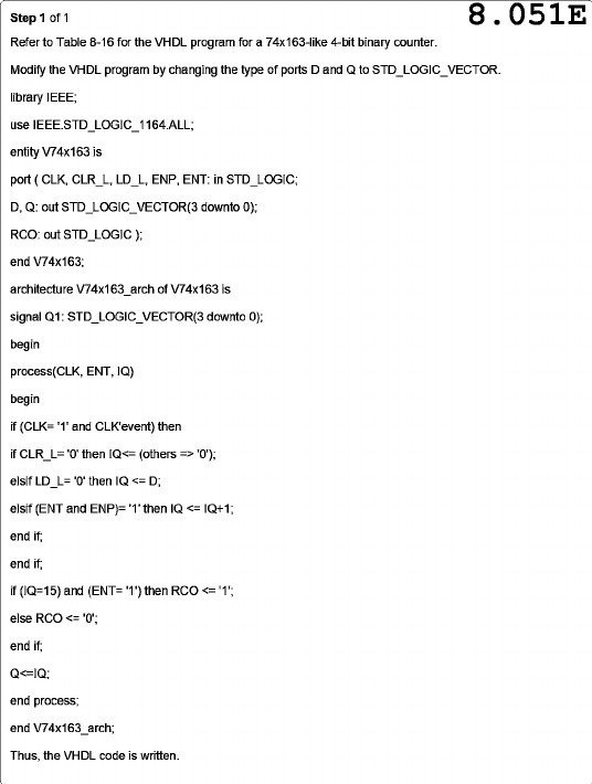 Step 1 of 1 8.051E Refer to Table 8-16 for the VHDL program for a 74x163-like 4-bit binary counter. Modify the VHDL program by changing the type of ports D and Q to STD_LOGIC_VECTOR. library IEEE; use IEEE.STD_LOGIC_1164.ALL; entity V74x163 is port (CLK, CLR_L, LD_L, ENP, ENT: in STD_LOGIC; D, Q: out STD_LOGIC_VECTOR(3 downto 0); RCO: out STD_LOGIC); end V74x163; architecture V74x163_arch of V74x163 is signal Q1: STD_LOGIC_VECTOR(3 downto 0); begin process(CLK, ENT, IQ) begin if (CLK= '1' and CLK'event) then if CLR_L= '0' then IQ '0'); elsif LD_L=' '0' then IQ