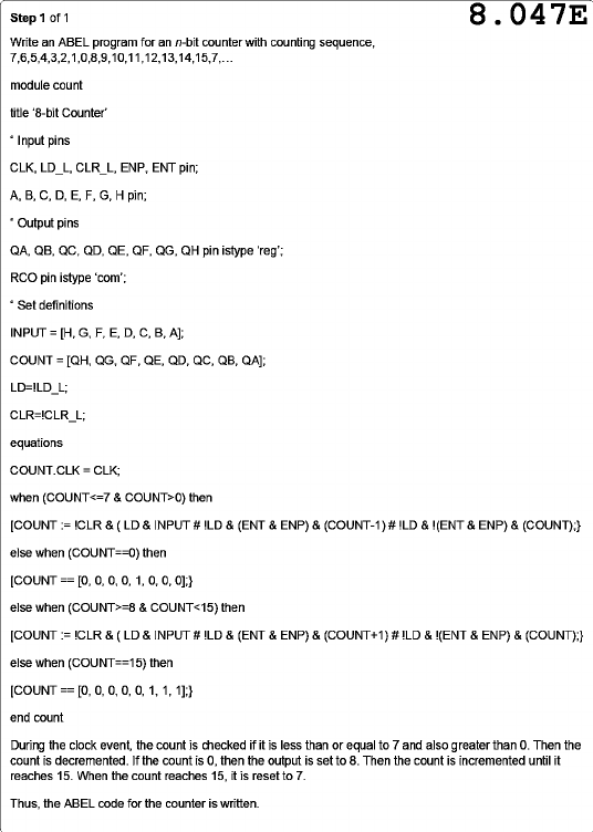 Step 1 of 1 8.047E Write an ABEL program for an n-bit counter with counting sequence, module count title '8-bit Counter' " "Input pins CLK, LD_L, CLR_L, ENP, ENT pin; A, B, C, D, E, F, G, H pin; " Output pins QA, QB, QC, QD, QE, QF, QG, QH pin istype RCO pin istype 'com'; definitions INPUT = [H, G, F, E, D, C, B, A]; COUNT = [QH, QG, QF, QE, QD, QC, QB, QA]; LD=!LD_L; CLR=!CLR_L; equations COUNT.CLK = CLK; when (COUNT0) then [COUNT := & (LD & INPUT # !LD & (ENT & ENP) & (COUNT-1) # !LD & !(ENT & ENP) & (COUNT);} else when (COUNT==0) then [COUNT == [0, 0, 0, 0, 1, 0, 0, 0];} else when (COUNT>=8 & COUNT