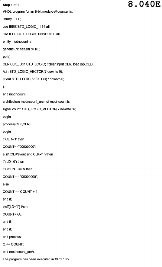 Step 1 of 1 8.040E VHDL program for an 8-bit modulo-N counter is, library IEEE; use use entity modncount is generic (N: natural := 10); port( CLR,CLK,LD:in STD_LOGIC; //clear input CLR, load input LD A:in STD_LOGIC_VECTOR(7 downto 0); Q:out STD_LOGIC_VECTOR(7 downto 0) ); end modncount; architecture modncount_arch of modncount is signal count: STD_LOGIC_VECTOR(7 downto 0); begin process(CLK,CLR) begin if CLR='1' then COUNT