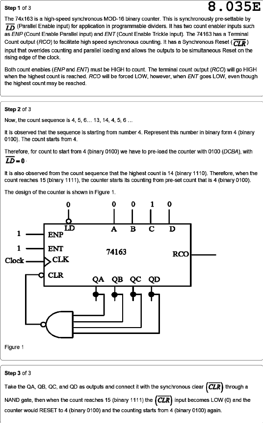 Step 1 of 3 8.035E The 74x163 is a high-speed synchronous MOD-16 binary counter. This is synchronously pre-settable by LD (Parallel Enable input) for application in programmable dividers. It has two count enabler inputs such as ENP (Count Enable Parallel input) and ENT (Count Enable Trickle input). The 74163 has a Terminal Count output (RCO) to facilitate high speed synchronous counting. It has a Synchronous Reset (CLR) input that overrides counting and parallel loading and allows the outputs to be simultaneous Reset on the rising edge of the clock. Both count enables (ENP and ENT) must be HIGH to count. The terminal count output (RCO) will go HIGH when the highest count is reached. RCO will be forced LOW, however, when ENT goes LOW, even though the highest count may be reached. Step 2 of 3 Now, the count sequence is 4, 5, 6 13, 14, 4, 5, 6 It is observed that the sequence is starting from number 4. Represent this number in binary form 4 (binary 0100). The count starts from 4. Therefore, for count to start from 4 (binary 0100) we have to pre-load the counter with 0100 (DCBA), with LD = 0 It is also observed from the count sequence that the highest count is 14 (binary 1110). Therefore, when the count reaches 15 (binary 1111), the counter starts its counting from pre-set count that is 4 (binary 0100). The design of the counter is shown in Figure 1. 0 0 0 1 0 LD A B C D 1 ENP 1 ENT 74163 RCO Clock CLK CLR QA QB QC QD Figure 1 Step 3 of 3 Take the QA, QB, QC, and QD as outputs and connect it with the synchronous clear CLR through a NAND gate, then when the count reaches 15 (binary 1111) the (CLR) input becomes LOW (0) and the counter would RESET to 4 (binary 0100) and the counting starts from 4 (binary 0100) again.