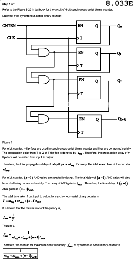 Step 1 of 1 8.033E Refer to the Figure 8-25 in textbook for the circuit of 4-bit synchronous serial binary counter. Draw the n-bit synchronous serial binary counter: CNTEN EN Q CLK T EN Q T EN Q 2 T EN Q T Figure 1 For n-bit counter, n-flip-flops are used in synchronous serial binary counter and they are connected serially. The propagation delay from T to Q of T-flip flop is denoted by Therefore, the propagation delay of n- flip-flops will be added from input to output. Therefore, the total propagation delay of n-flip-flops is Similarly, the total set-up time of the circuit is For n-bit counter, (n-1) AND gates are needed to design. The total delay of (n-1) AND gates will also be added being connected serially. The delay of AND gate is Therefore, the time delay of (n-1) AND gates is The total time taken from input to output for synchronous serial binary counter is, It is known that the maximum clock frequency is, Therefore, Therefore, the formula for maximum clock frequency, of synchronous serial binary counter is