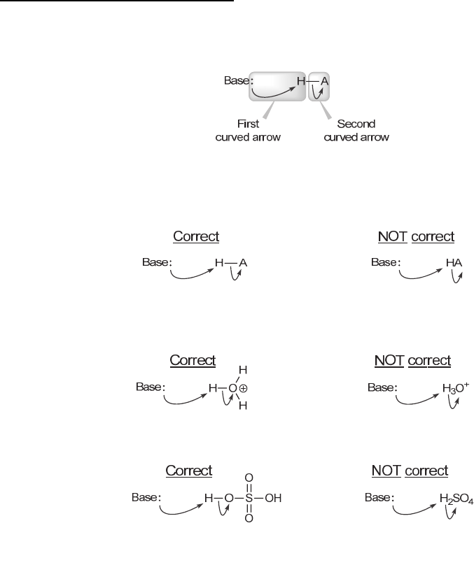 72 CHAPTER 3 Common Mistakes to Avoid When drawing the mechanism of a proton transfer, two curved arrows are required. The first curved arrow shows the base attacking the proton, and the second curved arrow shows the bond to H being broken. It is a common mistake to draw only the first curved arrow and not the second, so make sure to draw both curved arrows. When drawing the second curved arrow, make sure that the tail is placed on the middle of the bond to the H, as shown: When the acid is H3O+, you must draw at least one of the O–H bonds in order to draw the second curved arrow properly. This is also the case for other acids: www.MyEbookNiche.eCrater.com