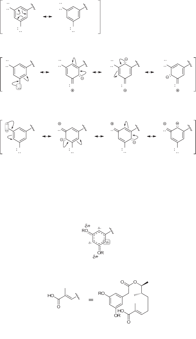 60 CHAPTER 2 This aromatic ring has eight significant resonance structures, shown below: OR RO OR RO OR RO OR RO OR RO OR RO OR RO OR RO OR RO OR RO resonance structure 1 resonance structure 2 resonance structure 1 resonance structure 3 resonance structure 4 resonance structure 5 resonance structure 1 resonance structure 6 resonance structure 7 resonance structure 8 The resonance hybrid is a weighted average of these eight resonance structures. Resonance structures 1 and 2 are equally most significant because all atoms have an octet AND there are no formal charges. Resonance structures 3-8 are less significant than 1 and 2 but equally significant to each other because every atom has a full octet with a positive charge on an oxygen atom and a negative charge on a carbon atom. Since the partial negative charge is delocalized onto three carbon atoms and the partial positive charge is delocalized onto only two oxygen atoms, the partial positive charges are drawn slightly larger than the partial negative charges. The analysis allows us to draw the resonance hybrid for this portion of the molecule, and it demonstrates that the highlighted carbon atom is -. Now let’s focus on our attention on the other highlighted carbon atom (the one that is part of a carboxylic acid group). Just as we did before, we will draw only the portion of the molecule that is of interest: www.MyEbookNiche.eCrater.com