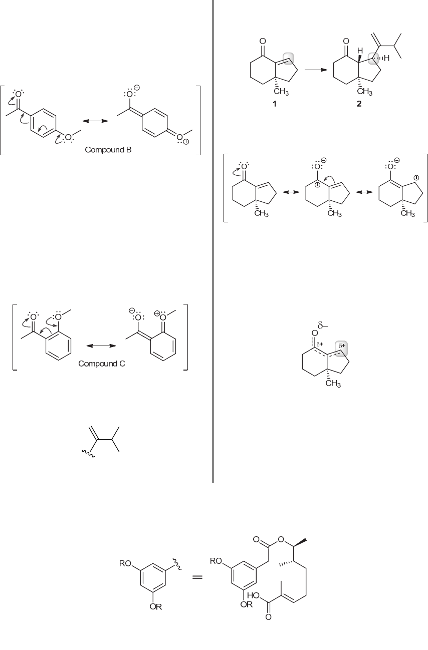 CHAPTER 2 59 2.68. (a) Compound B has one additional resonance structure that compound A lacks, because of the relative positions of the two groups on the aromatic ring. Specifically, compound B has a resonance structure in which one oxygen atom has a negative charge and the other oxygen atom has a positive charge: Compound A does not have a significant resonance structure in which one oxygen atom has a negative charge and the other oxygen atom has a positive charge. That is, compound A has fewer resonance structures than compound B. Accordingly, compound B has greater resonance stabilization. (b) Compound C is expected to have resonance stabilization similar to that of compound B, because compound C also has a resonance structure in which one oxygen atom has a negative charge and the other oxygen atom has a positive charge: 2.69. (a) The following group is introduced, and it contains five carbon atoms: (b) The following highlighted carbon atom is involved in the reaction: (c) Compound 1 has three significant resonance structures, shown here: The structure on the left is the most significant, because every atom has an octet and it has no formal charges. The resonance hybrid is a weighted average of these three resonance structures. Since the partial positive charge is delocalized onto two carbon atoms and the partial negative charge is localized on only one oxygen atom, the partial negative charge is drawn larger than each of the individual partial positive charges. (d) The reactive site has partial positive character, which means that it is electron deficient. This is what makes it reactive. In the actual synthesis, this compound is treated with a carbanion (a structure containing a carbon atom with a negative charge). The reaction causes formation of a bond between the electron-deficient carbon atom and the electron-rich carbon atom. We will learn that reaction in Chapter 21. 2.70. We will need to draw two resonance hybrids, one for each of the highlighted carbon atoms. One highlighted position is part of an aromatic ring, and we will begin by focusing on that position. In doing so, we can save time by redrawing only the relevant portion of the molecule, like this: www.MyEbookNiche.eCrater.com