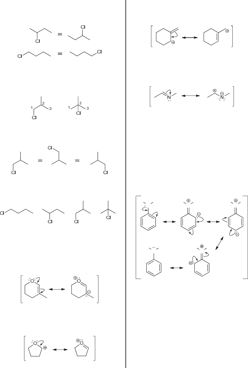 CHAPTER 2 51 Placing the chlorine atom at position 3 would be the same as placing it at position 2; and placing the chlorine atom at position 4 would be the same as it as position 1: Next, we move on to the other carbon skeleton, containing a branch. Once again, there are two distinctly different locations where a chlorine atom can be placed: either at position 1 or position 2, shown here. Placing the chlorine atom on any of the peripheral carbon atoms will lead to the same compound: In summary, there are a total of four constitutional isomers with the molecular formula C4H9Cl: 2.52. (a) This compound exhibits a lone pair next to a bond, so we draw the two curved arrows associated with that pattern. The first curved arrow is drawn showing a lone pair becoming a bond, while the second curved arrow shows a bond becoming a lone pair: (b) This structure exhibits a lone pair that is adjacent to a positive charge, so we draw one curved arrow, showing a lone pair becoming a bond: (c) This structure exhibits an allylic positive charge, so we draw one curved arrow showing the bond being pushed over. (d) This compound exhibits a C=N bond (a bond between two atoms of differing electronegativity), so we draw one curved arrow showing the bond becoming a lone pair. (e) This compound exhibits a lone pair next to a bond, so we draw two curved arrows. The first curved arrow is drawn showing a lone pair becoming a bond, while the second curved arrow shows a bond becoming a lone pair. We then draw the resulting resonance structure and assess whether it exhibits one of the five patterns. In this case, the lone pair is now next to another bond, so once again, we draw the two curved arrows associated with that pattern. The resulting resonance structure again exhibits a lone pair next to a bond. This pattern continues again, thereby spreading a negative charge over many locations, as shown here: N H N H N H N H N H H H H HH (f) This structure exhibits a lone pair next to a bond, so we draw two curved arrows. The first curved arrow is drawn showing a lone pair becoming a bond, while the second curved arrow shows a bond becoming a lone pair. We then draw the resulting resonance structure and assess whether it exhibits one of the five patterns. In this case, the lone pair is now next to another bond, so once again, we draw the two curved arrows associated with that pattern. The resulting resonance structure again exhibits a lone pair next to a bond, so we draw one more resonance structure, as shown here: www.MyEbookNiche.eCrater.com