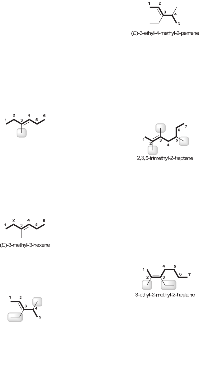 188 CHAPTER 7 (b) With a second-order rate equation, the rate is expected to be linearly dependent on the concentrations of the substrate and the base. If the concentration of the base is doubled, then the rate is expected to be two times faster. (c) With a second-order rate equation, the rate is expected to be linearly dependent on the concentrations of the substrate and the base. If the concentration of the substrate is doubled and the concentration of the base is tripled, then the rate is expected to be six times faster (×2×3). 7.12. (a) We begin by identifying the parent. The longest chain is six carbon atoms, so the parent is hexene. There is one substituent (highlighted), which is a methyl group. With respect to the bond, the parent could be numbered from either direction (either way, the double bond will be between C3 and C4), but in this case, we must assign numbers from left to right to give the substituent the lower possible number (C3 rather than C4). We include a locant that identifies the position of the double bond (“3” indicates that the double bond is located between C3 and C4), as well as a locant to identify the position of the substituent. Furthermore, we must include the configuration of the double bond (E): (b) We begin by identifying the parent, which must include the two carbon atoms bearing the double bond. The longest possible chain has five carbon atoms, so the parent is pentene. There is more than one choice for the parent, and we choose the parent with the greater number of substituents: There are two substituents (highlighted): a methyl group and an ethyl group. The parent is numbered to give the double bond the lowest possible number (C2). Therefore, the ethyl group is located at C3, and the methyl group is located at C4. These groups are arranged alphabetically, together with their locants, in the name. Finally, we must include the configuration of the double bond (E) at the beginning of the name: (c) We begin by identifying the parent. The longest chain is seven carbon atoms, so the parent is heptene. There are three substituents (highlighted), all of which are methyl groups. Notice that the parent chain is numbered starting from the side that is closest to the bond. According to this numbering scheme, the methyl groups are located at C2, C3, and C5. Finally, we use the prefix “tri” to indicate the presence of three methyl groups, and we include a locant that identifies the position of the double bond (“2” indicates that the double bond is located between C2 and C3): Note that the C2 position is connected to two methyl groups, so the double bond is not stereoisomeric (neither E nor Z). (d) We begin by identifying the parent. The longest chain is seven carbon atoms, so the parent is heptene. There are two substituents – a methyl group and an ethyl group (highlighted). Notice that the parent chain is numbered starting from the side that is closest to the bond. According to this numbering scheme, the methyl group is located at C2, and the ethyl group is located at C3. Finally, we arrange the substituents alphabetically, and we include a locant that identifies the position of the double bond: Note that the C2 position is connected to two methyl groups, so the double bond is not stereoisomeric (neither E nor Z). (e) We begin by identifying the parent. The longest chain (containing the double bond) is five carbon atoms, so the parent is pentene. There are three substituents – an isopropyl group and two methyl groups (highlighted). Notice that the parent chain is numbered starting from the side that is closest to the bond. According to this numbering scheme, the isopropyl group is located at C3, and the methyl groups are located at C2 and C4. Finally, we arrange the substituents alphabetically, and we www.MyEbookNiche.eCrater.com