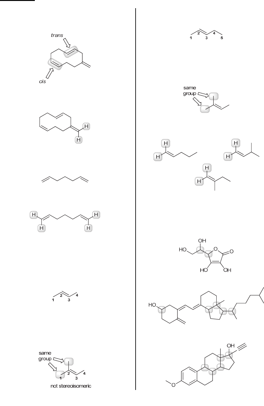 CHAPTER 5 133 Solutions 5.1. There are two C=C units in the ring (highlighted), and their configurations are shown below. The remaining C=C unit is not stereoisomeric, because it has two identical groups (hydrogen atoms) connected to the same position. 5.2. We first draw a bond-line structure, which makes it easier to see the groups that are connected to each of the double bonds. Each of the double bonds has two identical groups (hydrogen atoms) connected to the same position. As such, neither double bond exhibits stereoisomerism, so this compound does not have any stereoisomers. 5.3. (a) Compound X must contain a carbon-carbon double bond in the trans configuration, which accounts for four of the five carbon atoms: Now we must decide where to place the fifth carbon atom. We cannot attach this carbon atom to a vinylic position (C2 or C3), as that would give a double bond that is not stereoisomeric, and compound X is supposed to have the trans configuration. Therefore, we must attach the fifth carbon atom to an allylic position, giving the following compound: (b) Compound Y possesses a carbon-carbon double bond that is not stereoisomeric, which means that it must contain two identical groups connected to the same vinylic position. Those identical groups can be methyl groups, as in the following compound, or the identical groups can be hydrogen atoms, as in the following three compounds: 5.4. In each of the following cases, we ignore all sp2 hybridized carbon atoms, all sp hybridized carbon atoms, and all CH2 and CH3 groups. We identify those carbon atoms (highlighted below) bearing four different groups: (a) This compound has two chiral centers: (b) This compound has five chiral centers: (c) This compound has five chiral centers: www.MyEbookNiche.eCrater.com