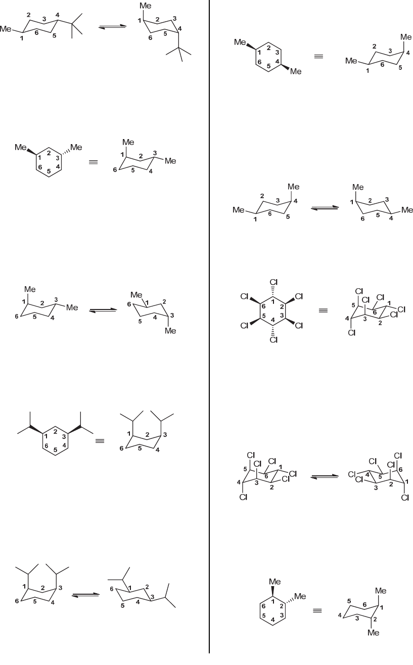 CHAPTER 4 115 (f) Begin by assigning a numbering system, and then determine the location and three-dimensional orientation of each substituent. In this case, there is a methyl group at C-1, which is up, and another methyl group at C-3, which is down: When assigning the numbers to the chair drawing, the first number can be placed anywhere on the ring (as long as the numbers go clockwise), as explained in the solution to part (a) of this problem. Finally, we draw the second chair conformation, once again using a numbering system. Notice that a ring flip causes all equatorial groups to become axial groups, and vice versa. (g) Begin by assigning a numbering system, and then determine the location and three-dimensional orientation of each substituent. In this case, there is an isopropyl group at C-1, which is up, and another isopropyl group at C-3, which is also up: When assigning the numbers to the chair drawing, the first number can be placed anywhere on the ring (as long as the numbers go clockwise), as explained in the solution to part (a) of this problem. Finally, we draw the second chair conformation, once again using a numbering system. Notice that a ring flip causes all equatorial groups to become axial groups, and vice versa. (h) Begin by assigning a numbering system, and then determine the location and three-dimensional orientation of each substituent. In this case, there is a methyl group at C-1, which is up, and another methyl group at C-4, which is also up: When assigning the numbers to the chair drawing, the first number can be placed anywhere on the ring (as long as the numbers go clockwise), as explained in the solution to part (a) of this problem. Finally, we draw the second chair conformation, once again using a numbering system. Notice that a ring flip causes all equatorial groups to become axial groups, and vice versa. 4.29. Begin by assigning a numbering system, and then determine the location and three-dimensional orientation of each substituent: When assigning the numbers to the chair drawing, the first number can be placed anywhere on the ring (as long as the numbers go clockwise), as explained in the solution to part (a) of the previous problem. Finally, we draw the second chair conformation, once again using a numbering system. Notice that a ring flip causes all equatorial groups to become axial groups, and vice versa. 4.30. (a) Begin by assigning a numbering system, and then determine the location and three-dimensional orientation of each substituent. In this case, there is a methyl group at C-1, which is up, and a methyl group at C-2, which is down: www.MyEbookNiche.eCrater.com