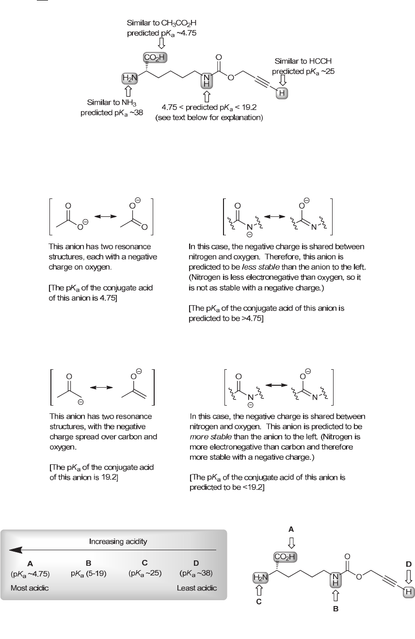CHAPTER 3 95 shown are not meant to be precise (due to other structural factors that can affect these values), but rather, they should be considered as rough approximations. The proton on the nitrogen atom adjacent to the C=O group is also a good candidate for one of our four most acidic protons, because it is bound to an electronegative atom (nitrogen). In this case there is no obvious molecule of comparison in Table 3.1. However, we can still make a reasonable prediction of pKa range by using our knowledge of the relationship between structure and acidity. First of all, we can predict that the pKa of the indicated proton is greater than 4.75 by making the following comparison: A second comparison with another molecule in Table 3.1 allows us to predict that the pKa of the proton of interest is lower than 19.2. After determining the approximate pKa values for each of the four most acidic protons, we can now rank them in order of increasing acidity. Recall that the lowest pKa value is associated with the most acidic proton: www.MyEbookNiche.eCrater.com
