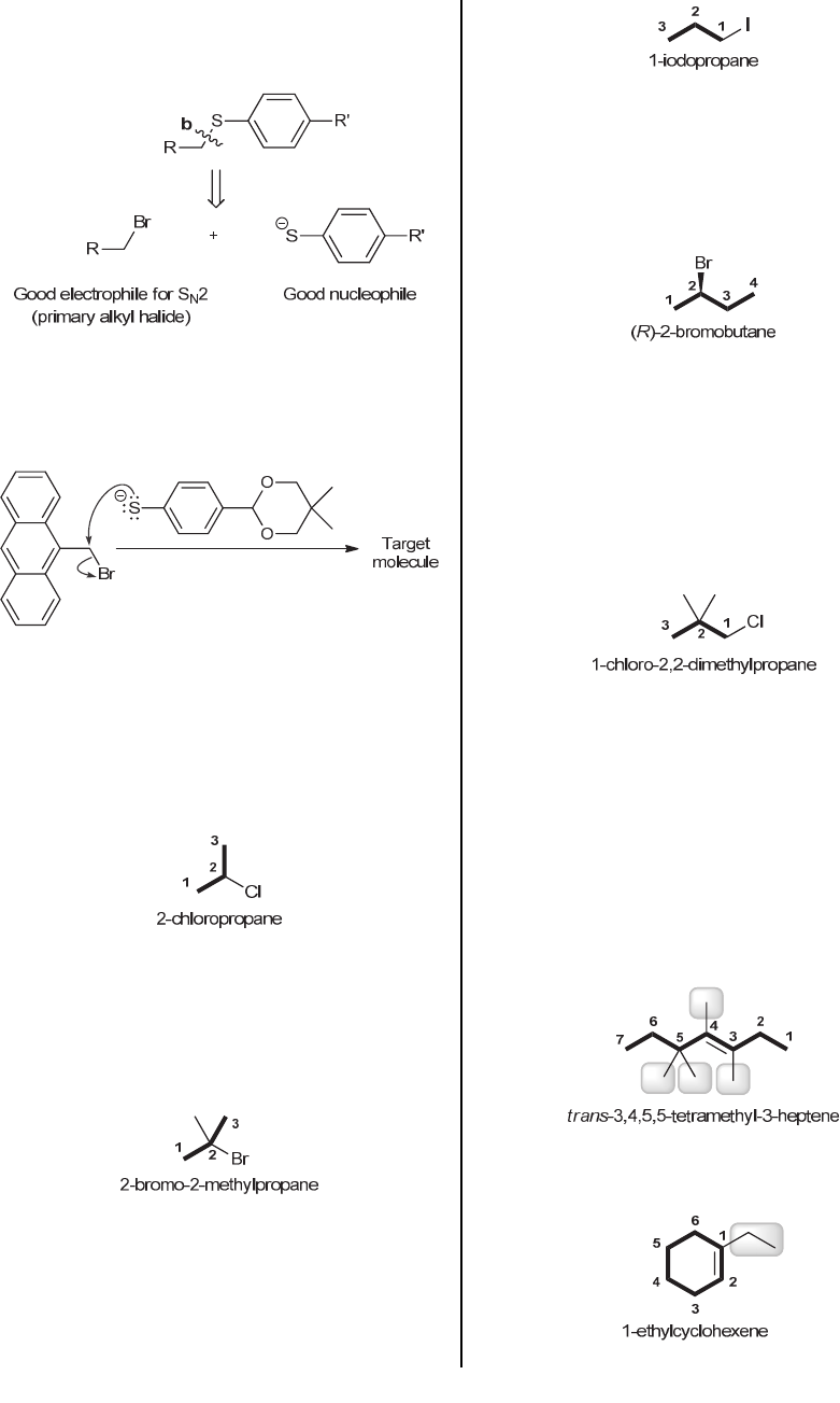 208 CHAPTER 7 The better retrosynthesis is based on disconnection of bond b, because it involves both a good electrophile and a good nucleophile: The SN2 process portrayed in retrosynthesis b is favorable, because it involves a strong nucleophile and a primary substrate, so this reaction is expected to give the desired target molecule. 7.47. (a) The parent is the longest chain, which is three carbon atoms in this case (propane). There is only one substituent (chloro), and its locant is assigned as 2 (as shown below), so the systematic name for this compound is 2-chloropropane. The common name is isopropyl chloride. (b) The parent is the longest chain, which is three carbon atoms in this case (propane). There are two substituents (bromo and methyl), and their locants are assigned as 2 and 2, as shown below. Substituents are alphabetized in the name (bromo precedes methyl), so the systematic name is 2-bromo-2-methylpropane. The common name is tert-butyl bromide. (c) The parent is the longest chain, which is three carbon atoms in this case (propane). There is only one substituent (iodo), and its locant is assigned as 1 (as shown), so the systematic name for this compound is 1- iodopropane. The common name is propyl iodide. (d) The parent is the longest chain, which is four carbon atoms in this case (butane). There is only one substituent (bromo), and its locant is assigned as 2 (as shown below). The compound has a chiral center, so the configuration must be indicated at the beginning of the name: (R)-2-bromobutane. The common name is (R)- sec-butyl bromide. (e) The parent is the longest chain, which is three carbon atoms in this case (propane). There are three substituents (chloro, methyl, and methyl), and their locants are assigned as 1, 2, and 2, respectively, as shown below. Substituents are alphabetized in the name (chloro precedes methyl). Make sure that each methyl group receives a locant (2,2-dimethyl rather than 2-dimethyl). The systematic name is therefore 1-chloro-2,2- dimethylpropane. The common name is neopentyl chloride. 7.48. (a) We begin by identifying the parent. The longest chain is seven carbon atoms, so the parent is heptene. There are four substituents (highlighted), all of which are methyl groups. Notice that the parent chain is numbered starting from the side that is closest to the bond. According to this numbering scheme, the methyl groups are located at C3, C4, C5 and C5. Finally, we use the prefix “tetra” to indicate the presence of four methyl groups, and we include a locant that identifies the position of the double bond (“3” indicates that the double bond is located between C3 and C4): (b) The parent is a six-membered ring (cyclohexene). There is only substituent (located at C1: www.MyEbookNiche.eCrater.com