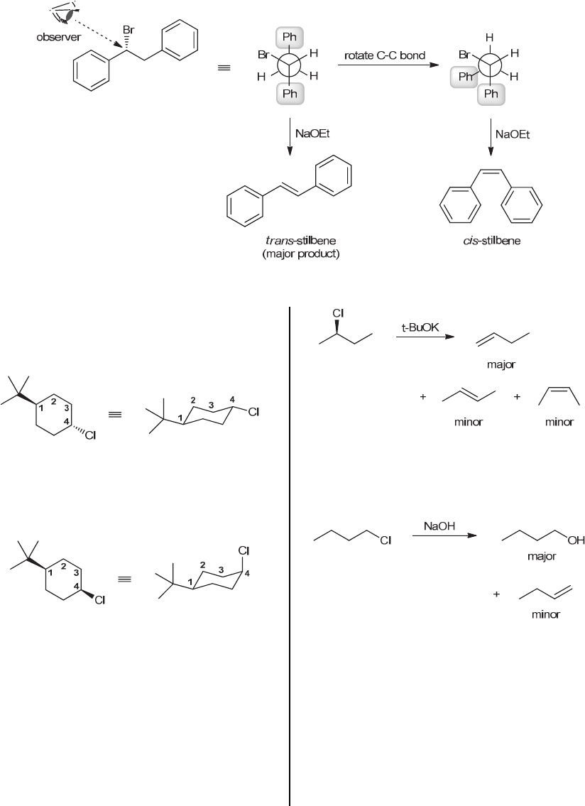 CHAPTER 7 217 (b) The same argument, as seen in the solution to part (a) of this problem, can be applied again in this case. That is, there are still two protons that can be abstracted in a elimination, so both products are still possible, as shown below. 7.75. Because of the bulky tert-butyl group, the trans isomer is essentially locked in a chair conformation in which the chlorine substituent occupies an equatorial position. This conformation cannot readily undergo an E2 reaction because the leaving group is not antiperiplanar to a proton. However, the cis isomer is locked in a chair conformation in which the chlorine occupies an axial position: This conformation rapidly undergoes an E2 reaction. 7.76. (a) The reagent is tert-butoxide, which is a strong, sterically hindered base. The substrate is secondary so we expect E2 processes to predominate (SN2 is highly disfavored because of steric interactions). The major product is the less-substituted alkene. The more- substituted alkene can be formed as either of two stereoisomers (cis and trans), giving the following three products: (b) The reagent is hydroxide, which is both a strong base and a strong nucleophile. The substrate is primary, so we expect both E2 and SN2 processes, although SN2 will be responsible for the major product, as shown here. (c) The reagent is ethoxide, which is both a strong base and a strong nucleophile. The substrate is secondary so we expect both E2 and SN2 processes, although E2 will be responsible for the major product. Accordingly, the major product is the more substituted alkene, with the trans configuration (because the reaction is stereoselective, favoring the trans isomer over the cis isomer). The minor products include the cis isomer, as well as the less-substituted alkene and the SN2 product (which is formed via inversion of configuration): www.MyEbookNiche.eCrater.com
