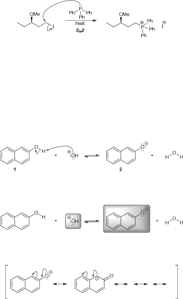 CHAPTER 7 225 In the final step of the process, the primary alkyl iodide is then treated with triphenylphosphine (PPh3), which functions as a nucleophile, giving another SN2 reaction, to afford a phosphonium salt. The factors favoring this step are the leaving group and the nucleophile. Let’s explore each separately. The leaving group is one of the best leaving groups that could be used (because HI is one of the strongest acids, pKa = -10). The nucleophile is PPh3. Why is it such a powerful nucleophile? Phosphorus is in the same column of the periodic table as nitrogen (5A), but it is in the third row, rather than the second row. As such, phosphorus is larger and more polarizable than nitrogen, and therefore more strongly nucleophilic. This argument is similar to the argument we saw in the text when we compared sulfur and oxygen. Recall that sulfur is larger and more polarizable than oxygen, and therefore, sulfur is very strongly nucleophilic (even if it lacks a negative charge). Similarly, PPh3 is a powerful nucleophile, even though it lacks a negative charge. (b) In the second step, one leaving group (tosylate) is replaced with another (iodide). Iodide is a better leaving group than tosylate, which renders step 3 more favorable. 7.90. (a) The proton connected to the oxygen atom is the most acidic proton in compound 1, so it is removed upon treatment with a strong base. We can justify that hydroxide is a suitable base to achieve the conversion of 1 to 2, with either a qualitative argument (based on structural comparisons) or with a quantitative argument (based on pKa values). Let’s start with the qualitative argument. Compare the structures of the anions on either side of the reaction. The negative charge in a hydroxide ion is localized on one oxygen atom, while the negative charge in the other anion is delocalized over one oxygen atom and five carbon atoms. As such, we expect the latter anion to be more stabilized (via resonance delocalization). The equilibrium will favor formation of the more stable anion. That is, hydroxide is a sufficiently strong base, because it is stronger (less stable) than anion 2. Alternatively, we can use a quantitative argument to justify why hydroxide is an appropriate base to use in this case. Specifically, we compare the pKa values of the acids on either side of the equilibrium. www.MyEbookNiche.eCrater.com