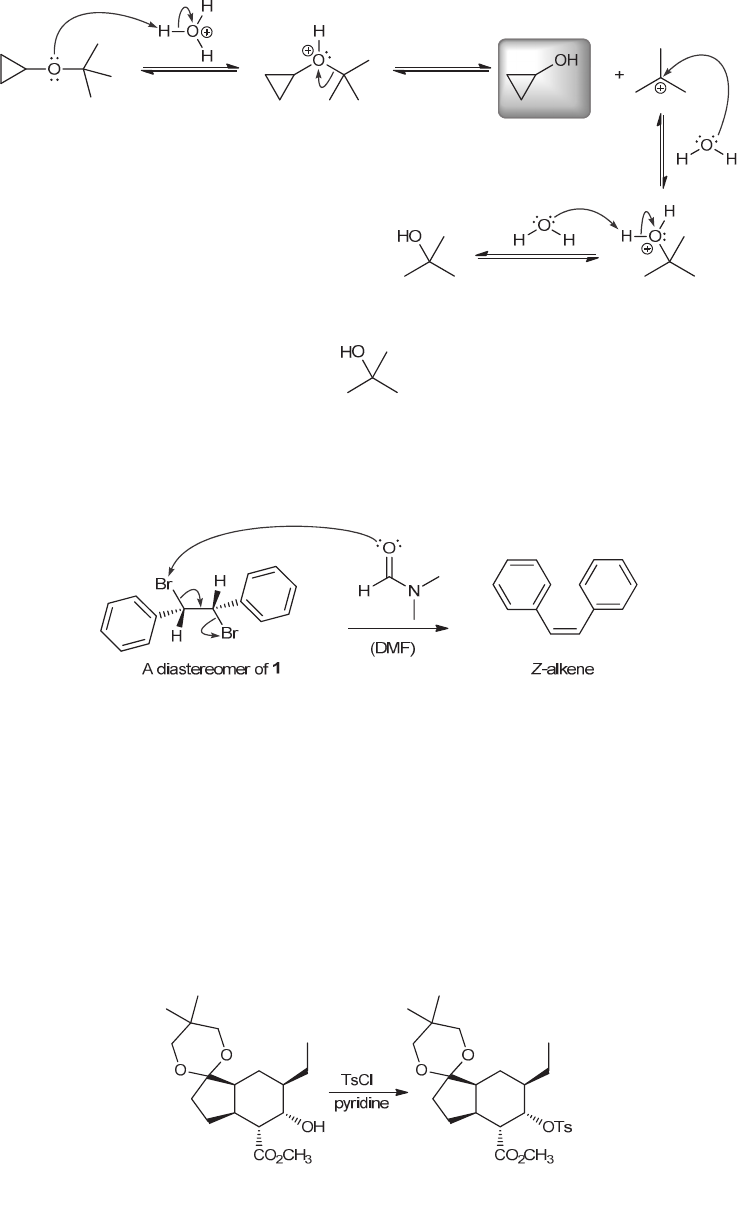 230 CHAPTER 7 (d) As seen in both the SN1 and SN2 pathways, the by-product is tert-butanol. 7.97. (a) The proposed mechanism is a concerted process that very closely resembles an E2 process. As such, we would expect this process to occur when the two bromine atoms are anti-periplanar to one another, as shown in the problem statement. If we perform the same reaction with a diastereomer of 1, we would expect a Z-alkene: But none of the Z-alkene is formed. The E isomer is obtained exclusively, which means that the preference for the E- isomer is not dependent on the configuration of the starting dibromide. The E-alkene is obtained either from 1 or from a diastereomer of 1. As such, the reaction does not appear to have a requirement for anti-periplanarity. This is evidence against a concerted mechanism. (b) The reaction is not considered to be stereospecific, because the preference for the E isomer is not dependent on the configuration of the starting dibromide. The reaction is stereoselective, because one configuration of the alkene product (the E isomer) is favored over the other. 7.98. In the first reaction, the OH group is converted into a better leaving group. Notice that the configuration of the center bearing the OH group does NOT change in the process (it remains a dash): Then, the second reaction employs DBU which is a strong base that generally does not function as a nucleophile. We therefore expect an E2 elimination process to occur. During an E2 process, the base removes a proton that is antiperiplanar to the leaving group. There are two positions, each of which has one proton, but only one of these protons is anti-periplanar to the leaving group: www.MyEbookNiche.eCrater.com
