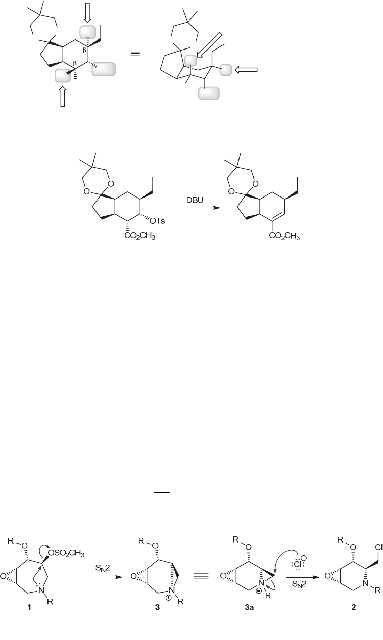 CHAPTER 7 231 O O OTs CO2CH3 OTs H O O H3CO2C H H NOT antiperiplanar to LG Antiperiplanar to LG H NOT antiperiplanar to LG Antiperiplanar to LG Therefore, we expect the following E2 product: 7.99. The substrate is primary and the reagent is a strong nucleophile, so this substitution reaction must occur via an SN2 pathway. SN2 reactions are bimolecular processes, so statement (a) is true. In an SN2 process, the rate is linearly dependent on the concentration of the nucleophile, so statement (b) is also true. Polar aprotic solvents enhance the rate of SN2 processes, so statement (c) is also true. Therefore, statement (d) must be false, and indeed, it is false. SN2 reactions do not proceed via carbocation intermediates. Carbocation intermediates are involved in SN1 reactions, but the alkyl halide is primary in this case, and a primary carbocation is too unstable to form. 7.100. The reagent is both a strong base and a strong nucleophile. With a secondary substrate, the E2 product is favored over the SN2 product. This rules out option (a). Since the base is not sterically hindered, we expect the Zaitsev product. That is, we expect a disubstituted alkene, rather than a monosubstituted alkene, so we can rule out option (b). Options (c) and (d) are cis/trans stereoisomers. Since the E2 process is stereoselective, we expect the trans isomer to predominate, so option (d) is the correct answer. 7.101. Option (a) involves a primary substrate being treated with hydroxide (which is both a strong nucleophile and a strong base). Under these conditions, the SN2 product is expected to predominate over the E2 product. Option (b) would give the more substituted alkene (trans-2-butene) as the major product, not 1-butene. Option (d) would also give the more substituted alkene (trans-2-butene) as the major product. Only option (c) will give 1-butene. 7.102. Compound 1 exhibits a mesylate group (OSO2CH3) as a good leaving group (described in Section 7.12). Upon its formation, compound 1 undergoes an intramolecular SN2-type reaction, in which the nitrogen atom functions as the nucleophile. This results in the formation of a three-membered nitrogen-containing ring fused to a six-membered ring (3). Notice the stereochemistry: the nitrogen atom displaced the mesylate from the back face of the molecule, resulting in inversion at the original chiral center. Next, an intermolecular SN2 reaction occurs: the chloride ion attacks the three- membered ring at the least hindered site, resulting in the formation of the product (2). Notice that the configuration of the chiral center (that underwent inversion in the first SN2-type reaction) does not change during this second SN2 reaction (in this step, chloride attacks a carbon atom that is not a chiral center). www.MyEbookNiche.eCrater.com