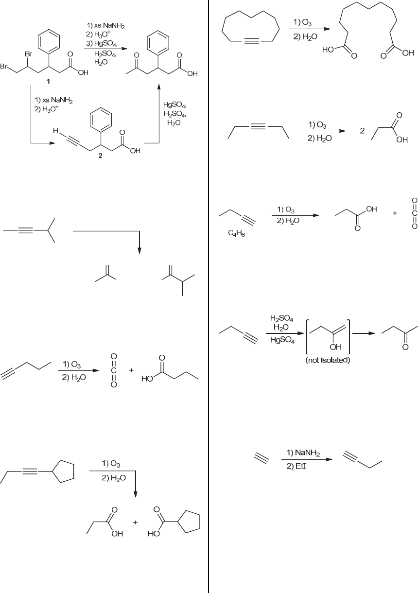 CHAPTER 9 291 In summary, the following reagents can be used to convert 1 into 3: 9.24. (a) The reagents (O3, followed by H2O) indicate ozonolysis. The starting material is an unsymmetrical, internal alkyne, so cleavage of the C≡C bond results in the formation of two carboxylic acids: OH O HO O + 1) O3 2) H2O (b) The reagents (O3, followed by H2O) indicate ozonolysis. The starting material is a terminal alkyne, so cleavage of the C≡C bond results in the formation of a carboxylic acid and carbon dioxide (CO2): (c) The reagents (O3, followed by H2O) indicate ozonolysis. The starting material is an unsymmetrical, internal alkyne, so cleavage of the C≡C bond results in the formation of two carboxylic acids: (d) The reagents (O3, followed by H2O) indicate ozonolysis. The starting material is a cycloalkyne, so cleavage of the C≡C bond results in the formation of a compound with two carboxylic acid groups: 9.25. If ozonolysis produces only one product, then the starting alkyne must be symmetrical. There is only one symmetrical alkyne with the molecular formula C6H10: 9.26. If ozonolysis produces a carboxylic acid and carbon dioxide, then the starting alkyne must be terminal. There is only one terminal alkyne with the molecular formula C4H6: When this alkyne is treated with aqueous acid in the presence of mercuric sulfate, the alkyne is expected to undergo a Markovnikov addition of H and OH, generating an enol. This enol is not isolated, because upon its formation, it undergoes tautomerization to give a methyl ketone: 9.27. (a) We begin by drawing the starting material (acetylene) and the product (1-butyne), which makes it more clear to see that the desired transformation involves a single alkylation process. This can be achieved by treating acetylene with sodium amide, followed by ethyl iodide: (b) We begin by drawing the starting material (acetylene) and the product (2-butyne), which makes it more clear to see that the desired transformation involves two, successive alkylation processes. The first alkylation is achieved by treating acetylene with sodium amide, followed by methyl iodide. The second alkylation process is then achieved upon further treatment with sodium amide, followed by methyl iodide. Notice that each alkylation process must be performed separately. www.MyEbookNiche.eCrater.com