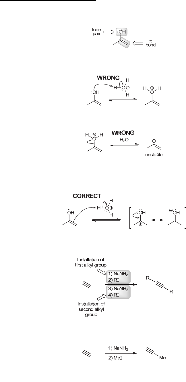 280 CHAPTER 9 Common Mistakes to Avoid When drawing a mechanism for the acid-catalyzed tautomerization of an enol, the first step is protonation. Students sometimes get confused about where to place the proton during this first step. Indeed, there are two possible locations where protonation could occur (a lone pair or the bond): Don’t forget that it is the bond that is protonated during tautomerization of the enol. It is a common student error to protonate the OH group, like this: If you make this mistake, you might then be tempted to make another critical mistake - formation of a vinyl carbocation, which is likely too unstable to form (and does not get us any closer to obtaining the ketone). Whenever possible, avoid the formation of high-energy intermediates that are unlikely to form. This is a general rule that should be followed whenever you are drawing a mechanism (exceptions are rare). The correct first step for acid-catalyzed tautomerization of an enol is protonation of the bond to generate a resonance-stabilized cation: There is one other (unrelated) common error that should be avoided. When designing a synthesis in which acetylene is alkylated twice, make sure to alkylate each side separately, even if both alkyl groups are the same: It is a common student error to show the reagents just one time, assuming that alkylation will occur on both sides of acetylene. If the reagents for alkylation are only shown once, then alkylation will only occur once: www.MyEbookNiche.eCrater.com