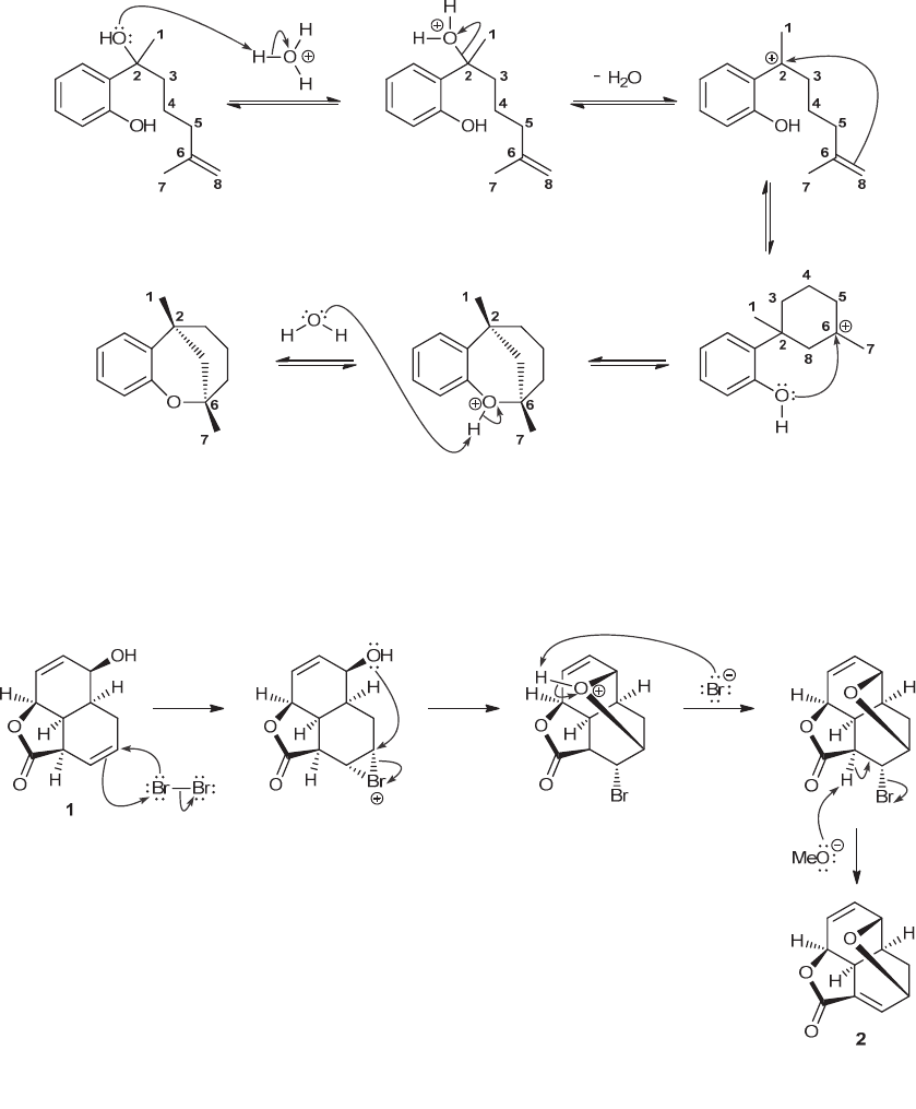 276 CHAPTER 8 Based on this, a possible mechanism is illustrated below. Protonation of the tertiary alcohol, followed by loss of water, gives the stable tertiary benzylic carbocation (at C2). Markovnikov attack by the terminal alkene (C6 and C8) at the tertiary benzylic carbocation affords a tertiary carbocation at C6. This carbocation is then attacked by the phenolic oxygen to afford the final product after removal of the acidic proton. 8.96. The first step involves formation of a bromonium ion, which requires three curved arrows (See Mechanism 8.5), followed by an intramolecular nucleophilic attack in which the OH group functions as a nucleophilic center and attacks the bromonium ion. Deprotonation then affords a cyclic ether. In the last step, a methoxide ion functions as a base and removes a proton, which leads to expulsion of bromide in an E2 process. You might be wondering about the stereochemistry of the last step (the E2 process). In general, E2 processes occur more rapidly when the H and the leaving group are anti-periplanar in the transition state. However, it is possible for an E2 process to occur via a transition state in which the H and leaving group are syn-periplanar. In general, this is not favored (the transition state is high in energy because all groups are eclipsed rather than staggered), but in this case, the rigid geometry of the polycyclic structure essentially locks the H and the leaving group into a syn-periplanar arrangement, where the H and the leaving group are eclipsing each other. As such, the reaction can occur, because the minimum requirement of periplanarity is still met. www.MyEbookNiche.eCrater.com