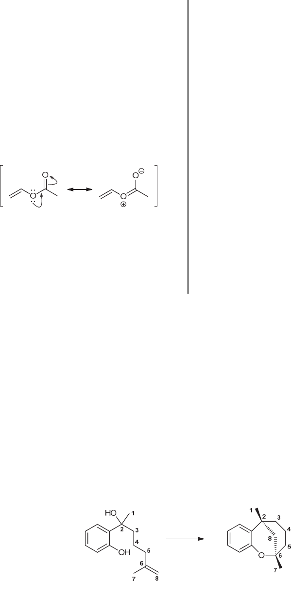 CHAPTER 8 275 withdrawing. Therefore, the bonds in these cases are less electron-rich than in compounds 1 or 2. The acetoxy group of alkene 5 is expected to be a stronger electron- withdrawing group than the methoxy group of 3 since the carbonyl group in the former compound will enhance the electron-withdrawing ability of the oxygen atom via resonance. Compound 4 is interesting in that the acetoxy oxygen atom is expected to be an electron-donating group with respect to the alkene bond (via resonance), much like the oxygen atom in compound 1. From the relative reactivity data, however, the lone pairs on the acetoxy oxygen are apparently less efficient at donating to the carbon-carbon bond. This can be explained by recognizing that the lone pairs on the acetoxy oxygen are already partially delocalized into the carbonyl group: That is, the lone pairs on the acetoxy oxygen are less available to donate electron density to the bond. Therefore, the acetoxy group of 4 influences the reactivity primarily through its inductive and steric effects, which will be much like that of the substituents in compounds 3 and 5. (b) Compound 6 is apparently able to impose the electron-withdrawing effect due to induction of the –CN group on the alkene bond via the shorter bond (due to the sp3-sp orbital overlap) between the CH2 and the CN groups, and thus the closer proximity of the partial positive charge to the electrons of the alkene. This is apparent when comparing the relative rates between compounds 5 and 6. Here, though the oxygen atom in compound 5 is more electronegative than carbon, the carbon atom of the cyano group apparently possesses a very large partial positive change that effectively renders this carbon atom more electronegative than that of the acetoxy oxygen atom of 5. The low reactivity associated with compound 7 may be due to both induction and steric effects, since the inductive withdrawal of electron density by the chlorine atom is not expected to exceed the substituent in compound 5. (c) Compounds 2, 8 and 9 illustrate the consequences of steric effects on the hydroboration reaction. Compounds 8 and 9 are the only disubstituted alkenes among the series, and it is not surprising that they have the lowest relative reactivity, due to increased steric effects. They are more than 100 times lower in reactivity than compound 2, the only monosubstituted alkene with no significant electronic effects (i.e. resonance and induction). In compound 9, the electron-withdrawing effect of the chlorine atom, which is superimposed upon the increased steric effect, further lowers the reactivity. 8.95. When approaching this problem, it would be advisable to first label the carbon side chain coming off the benzene ring so that you can determine what new connections have been made. Your numbering system does not need to conform to IUPAC rules for assigning locants. Rather, it is OK to use an arbitrary numbering system, because the goal of the numbering system is to track the fate of all atoms during the transformation: With this numbering system, the benzene ring is attached to C2 of the chain and the phenolic oxygen is attached to C6 of the chain. www.MyEbookNiche.eCrater.com