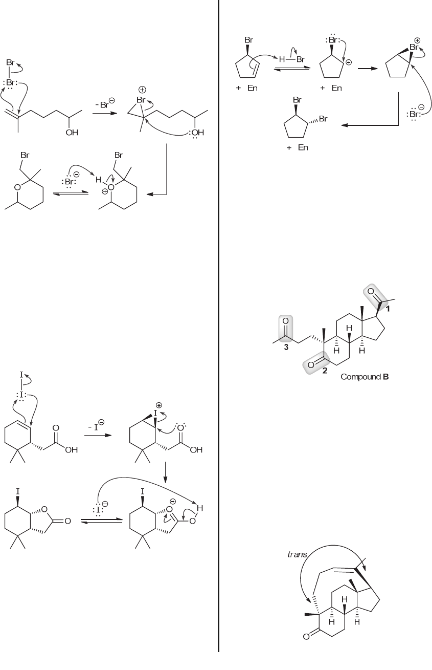 268 CHAPTER 8 the OH group that is tethered to the bromonium group. The resulting intramolecular nucleophilic attack (two curved arrows) generates an oxonium ion, which then loses a proton (two curved arrows) to give the product. 8.82. When the alkene is treated with molecular iodine (I2), the bond functions as a nucleophilic center and attacks I2 (three curved arrows), resulting in an intermediate iodonium ion. The iodonium ion is then subject to attack by a nucleophile, such as the nucleophilic center that is tethered to the iodonium group. The resulting intramolecular nucleophilic attack (two curved arrows) generates an intermediate which then loses a proton (two curved arrows) to give the product. 8.83. The cis-dibromide is not obtained, suggesting that the reaction proceeds via an anti addition process. This can be explained if we argue that the carbocation (formed upon protonation of the bond) is converted into a bromonium ion, as shown here. The incoming nucleophile (bromide) would have to attack from the backside of the bromonium bridge, giving a trans dibromide: 8.84. Inspection of the molecular formula reveals that compound A contains the same number of carbon atoms as the product of ozonolysis, compound B (21 carbon atoms). Thus, we can predict the structure of compound A by choosing any two carbonyl (C=O) groups in the product, removing the oxygen atoms, and connecting the sp2 hybridized carbon atoms with a double bond. There are three carbonyl groups, so there are three possible alkenes that should be considered. Attachment of carbons 1 and 2 would result in a complex ring system with far too much strain to possibly exist. Carbons 1 and 2 are remotely located on opposite ends of the molecule, pointing in opposite directions. Indeed, we will later learn that this polycyclic skeletal structure is very rigid, and the hypothetical connection of carbons 1 and 2 is impossible. Similarly, if carbons 1 and 3 were attached it would also result in significant strain (below). Though these carbons are closer than 1 and 2, and they are linked by a slightly more flexible chain, the trans relationship of the two connecting groups creates too much angle strain: www.MyEbookNiche.eCrater.com