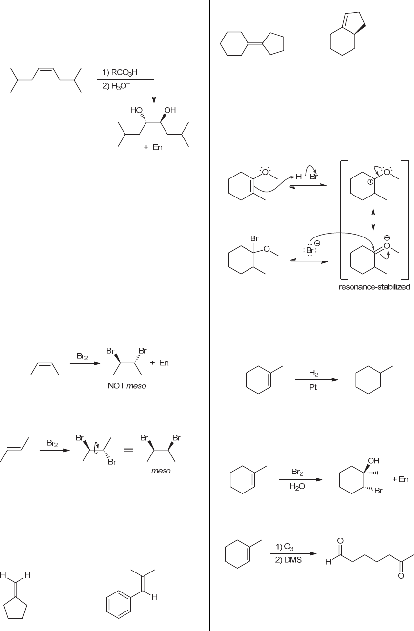 262 CHAPTER 8 is not relevant because the two groups added (OH and OH) are identical. We expect the reaction to proceed via an anti addition. In this case, two chiral centers are formed, so we expect the pair of enantiomers resulting from an anti addition: 8.58. (a) Hydroboration-oxidation gives an anti-Markovnikov addition. If 1-propene is the starting material, the OH group will not be installed in the correct location. Acid- catalyzed hydration of 1-propene would give the desired product. (b) Hydroboration-oxidation gives a syn addition of H and OH across a double bond. This compound does not have a proton that is cis to the OH group, and therefore, hydroboration-oxidation cannot be used to make this compound. (c) Hydroboration-oxidation gives an anti-Markovnikov addition. There is no starting alkene that would yield the desired product via an anti-Markovnikov addition. 8.59. Bromination of cis-2-butene does NOT give the desired meso compound: In contrast, trans-2-butene gives the desired meso compound, as shown: Therefore, compound X is trans-2-butene. 8.60. In each of the following cases, we draw the necessary alkene by removing the oxygen atoms from the product and connecting the sp2 hybridized carbon atoms to form a C=C bond: (a) (b) (c) (d) 8.61. In the presence of a strong acid, the bond is protonated to give a resonance-stabilized cation (shown below), which is even lower in energy than a tertiary carbocation. This protonation step determines the regiochemical outcome of the reaction, because the resonance-stabilized cation is captured by a bromide ion to give the product, as shown. 8.62. (a) The two groups being added across the alkene are H and H, which can be accomplished by treating the alkene with molecular hydrogen (H2) in the presence of a suitable catalyst. (b) The two groups being added across the alkene are Br and OH in an anti fashion, with the latter being installed at the more substituted position. This can be achieved by treating the alkene with Br2 in the presence of water (halohydrin formation): (c) Cleavage of the C=C double bond can be achieved via ozonolysis: (d) The two groups being added across the alkene are H and OH. The OH group must be installed at the less- substituted carbon atom, so we must use conditions that give an anti-Markovnikov addition of H and OH. This www.MyEbookNiche.eCrater.com