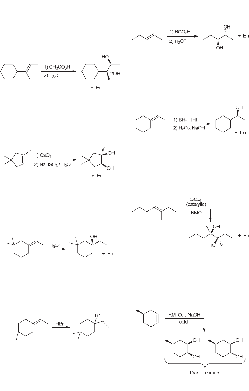 252 CHAPTER 8 (c) The first reagent is a peroxy acid, indicating formation of an epoxide, which is then opened under aqueous acidic conditions. The net result is expected to be the addition of OH and OH across the alkene. The regiochemical outcome is not relevant because the two groups added (OH and OH) are identical. For the stereochemical outcome, we notice that two chiral centers are formed, and we expect only the pair of enantiomers resulting from an anti addition: (d) The reagents indicate a dihydroxylation reaction, so the net result will be the addition of OH and OH across the alkene. The regiochemical outcome is not relevant because the two groups added (OH and OH) are identical. We expect the reaction to proceed via a syn addition. In this case, two chiral centers are formed, so we expect only the pair of enantiomers resulting from a syn addition: (e) The reagent indicates an acid-catalyzed hydration, so the net result will be the addition of H and OH across the alkene. We expect a Markovnikov addition, so the OH group will be installed at the more-substituted position. Only one chiral center is formed, so we expect the following pair of enantiomers: (f) The reagent indicates a hydrobromination reaction, so the net result will be the addition of H and Br across the alkene. We expect a Markovnikov addition, so the Br group will be installed at the more-substituted position. No chiral centers are formed in this case, so stereochemistry is irrelevant: (g) The reagents indicate a dihydroxylation process (via an epoxide), so the net result will be the addition of OH and OH across the alkene. The regiochemical outcome is not relevant because the two groups added (OH and OH) are identical. We expect the reaction to proceed via an anti addition. In this case, two chiral centers are formed, so we expect only the pair of enantiomers resulting from an anti addition: (h) The reagents indicate a hydroboration-oxidation, so the net result will be the addition of H and OH across the alkene. For the regiochemical outcome, we expect an anti-Markovnikov addition, so the OH group is installed at the less-substituted position. We expect the reaction to proceed via a syn addition, but only one chiral center is formed, so we expect both enantiomers (syn addition can occur on either face of the starting alkene): (i) The reagents indicate a dihydroxylation reaction, so the net result will be the addition of OH and OH across the alkene. The regiochemical outcome is not relevant because the two groups added (OH and OH) are identical. We expect the reaction to proceed via a syn addition. In this case, two chiral centers are formed, so we expect only the pair of enantiomers resulting from a syn addition: 8.32. The net result will be the addition of OH and OH across the alkene. The regiochemical outcome is not relevant because the two groups added (OH and OH) are identical. We expect the reaction to proceed via a syn addition. In this case, two chiral centers are formed, so we expect the two products shown below. Because of the presence of a third chiral center, these two products are diastereomers, rather than enantiomers. www.MyEbookNiche.eCrater.com